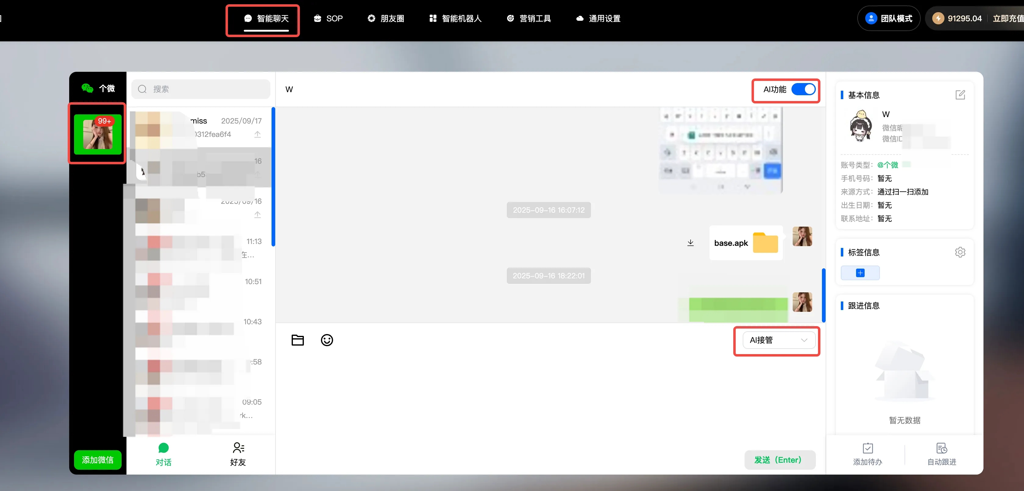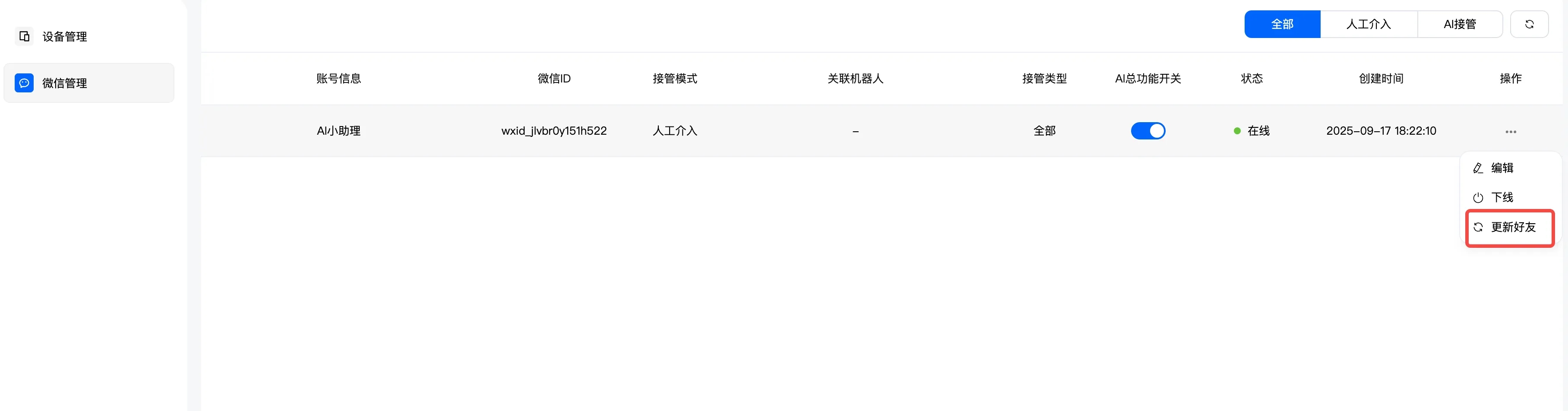 1.打开AI总功能开关–填写账号备注–接管模式选择AI接管–选择AI接管机器人(步骤一所设置的机器人)–设置完成点击确认
