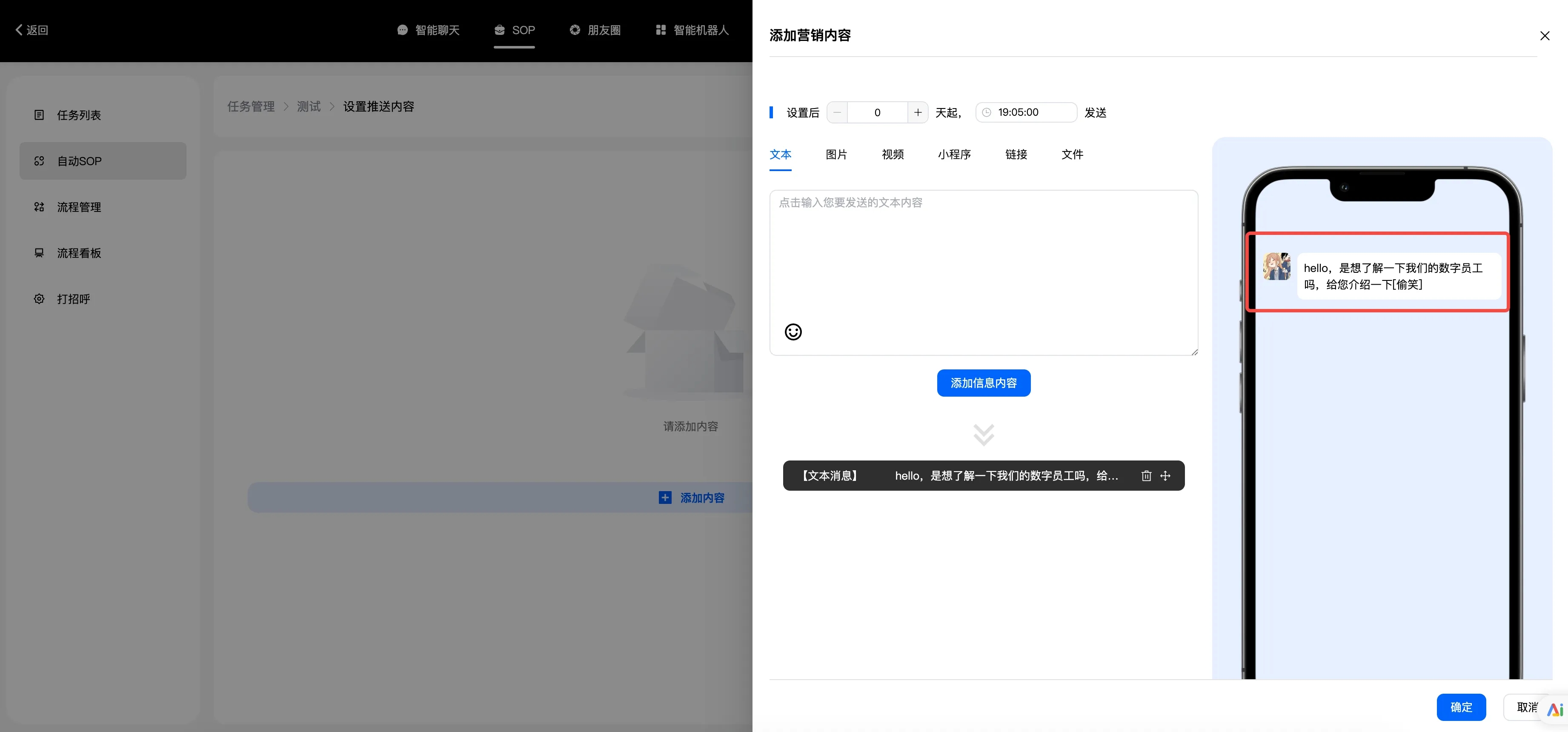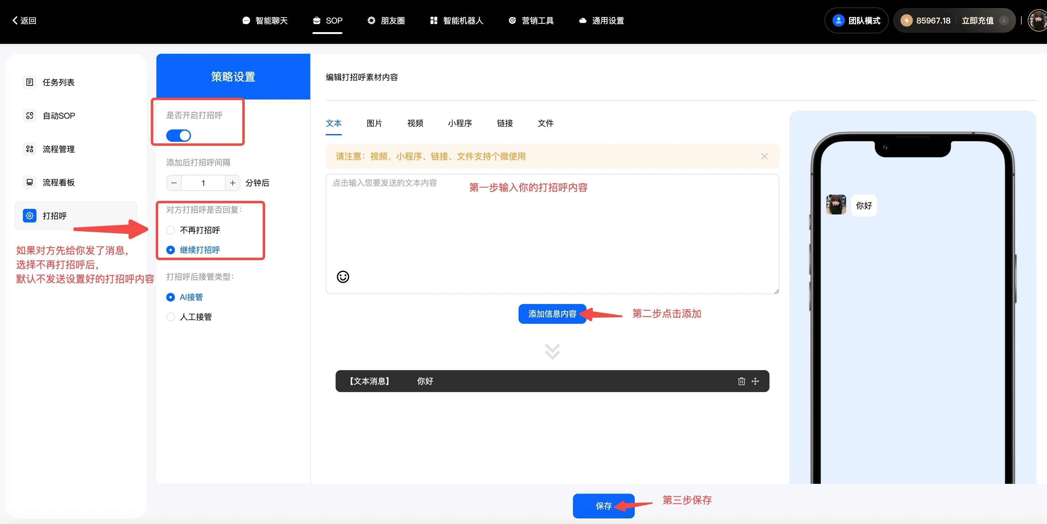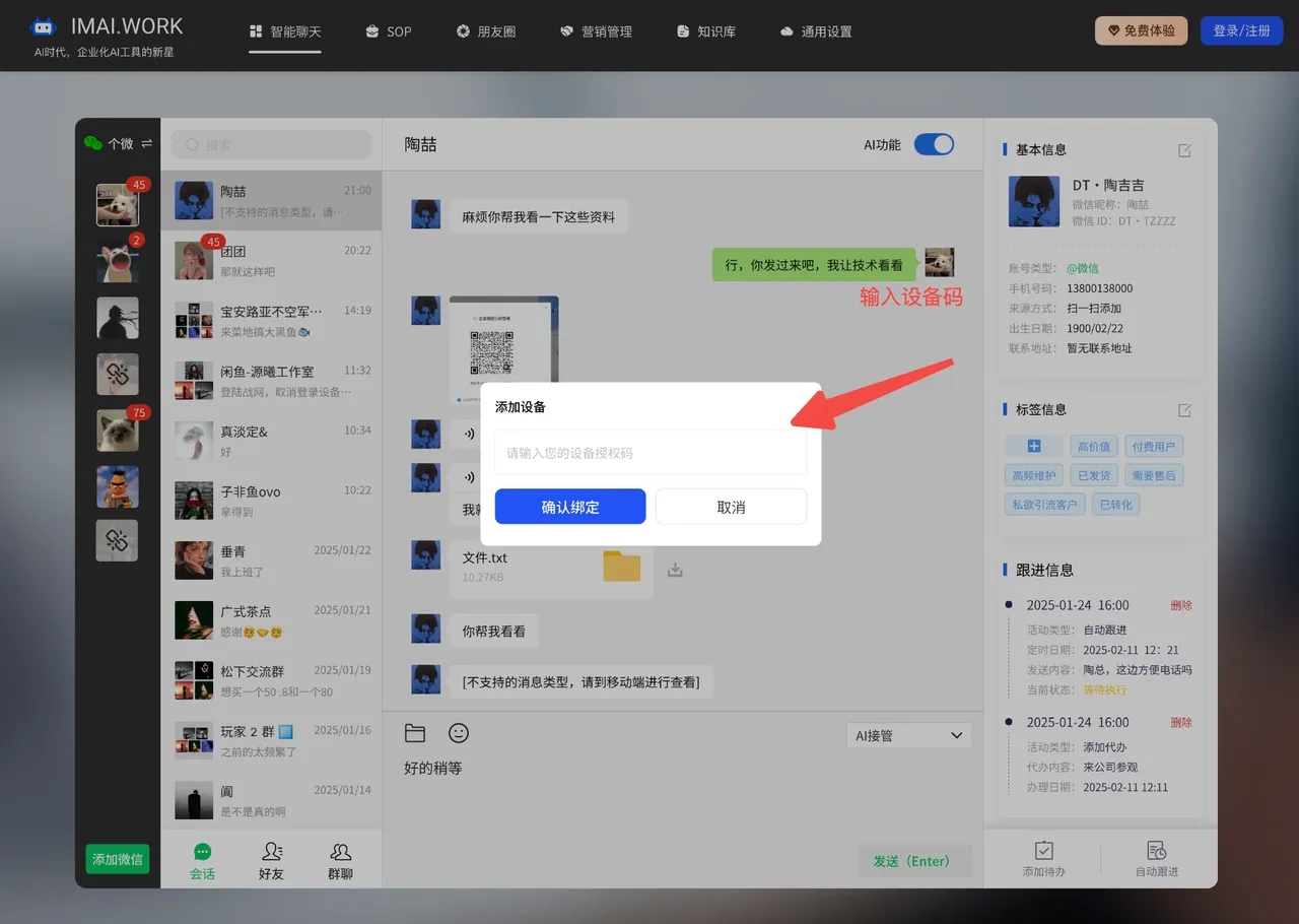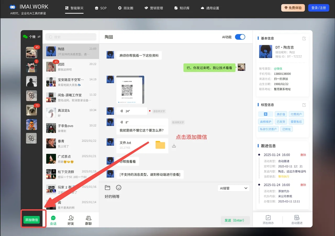自动跟进:是指客户一直停留在某个阶段,比如说他来找你买东西,一直问你价格,但就是不付款,也就是他在询价阶段一直不进入付款阶段,系统识别到了,你就可以设置一个询问话术,他到时间就会告诉客户是不是不满意还是怎么了