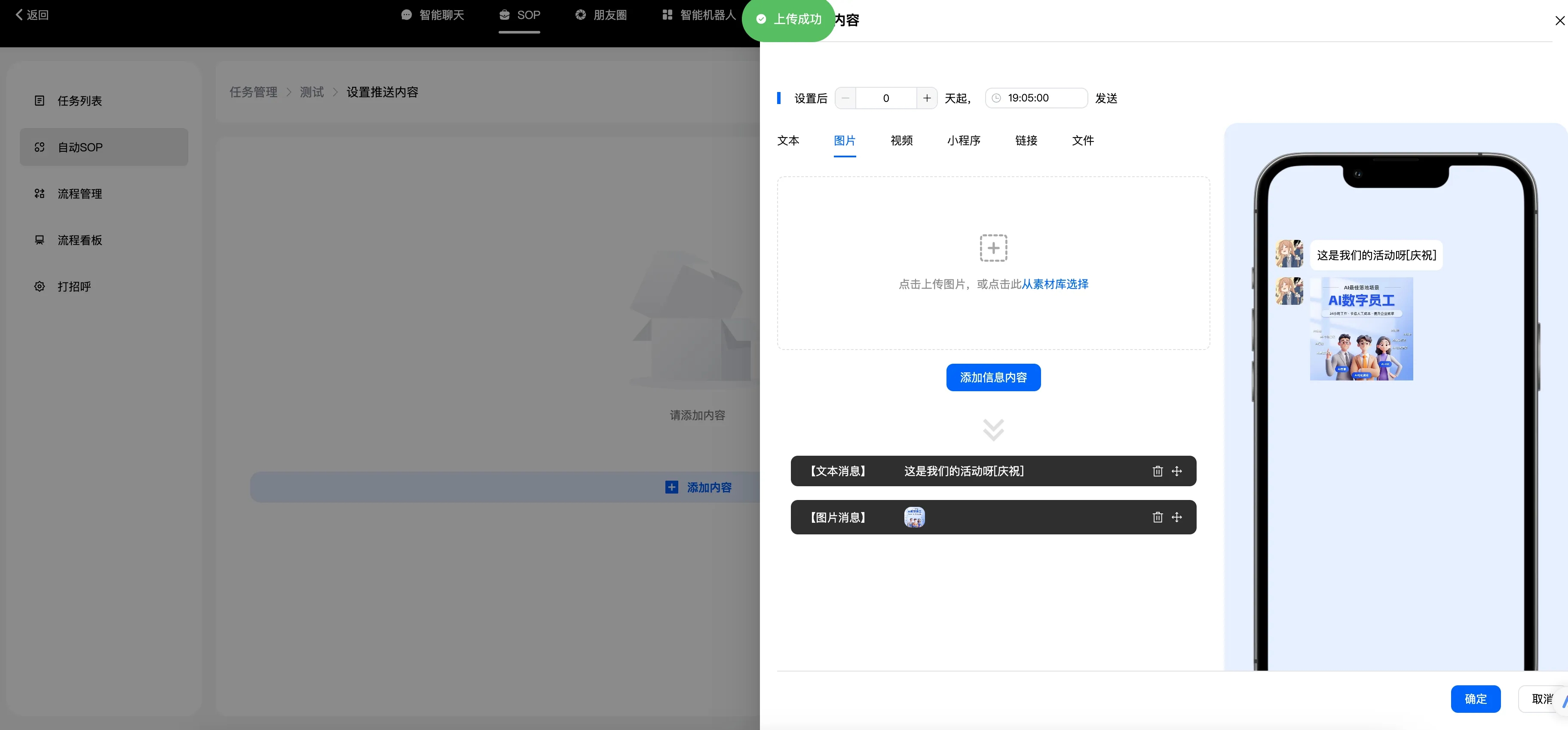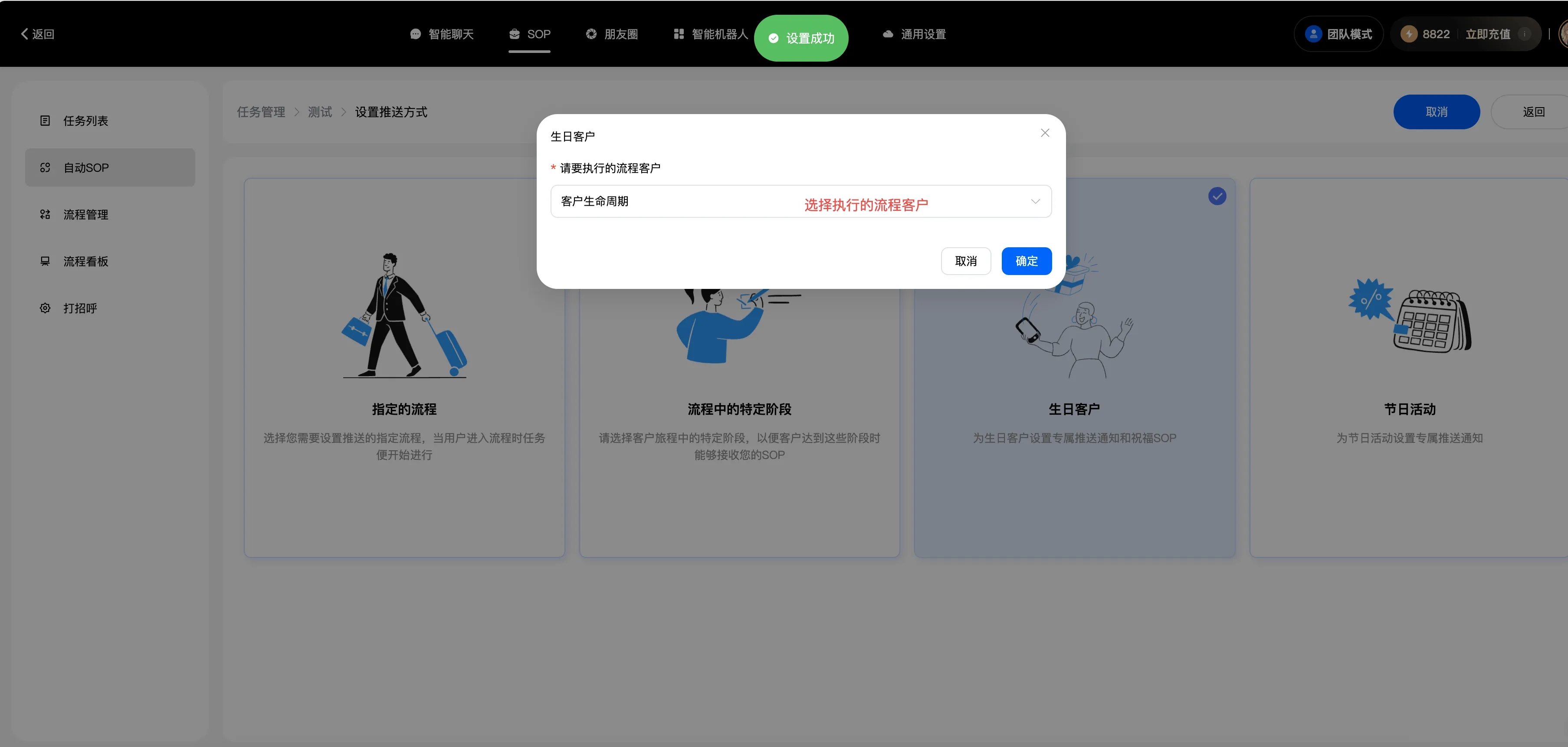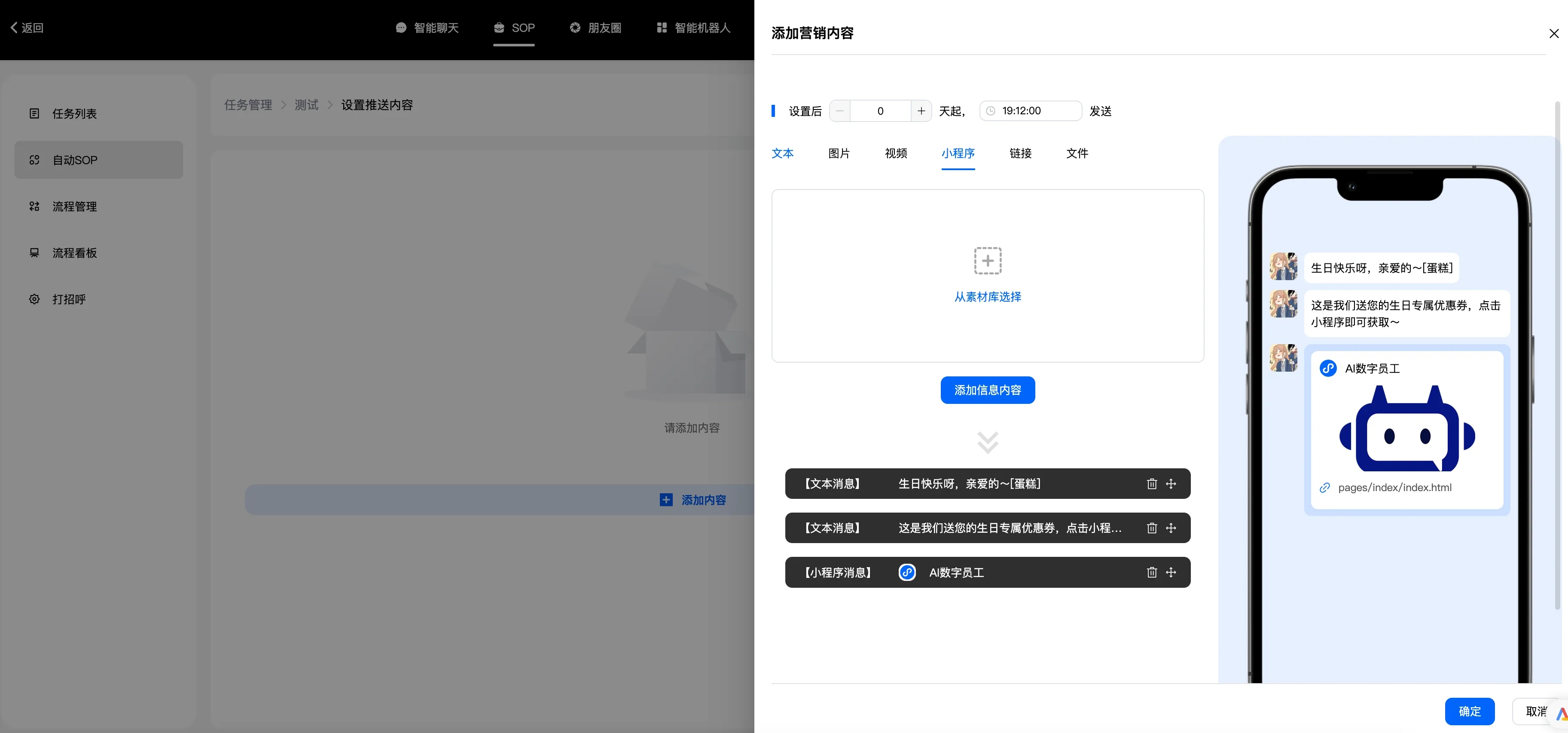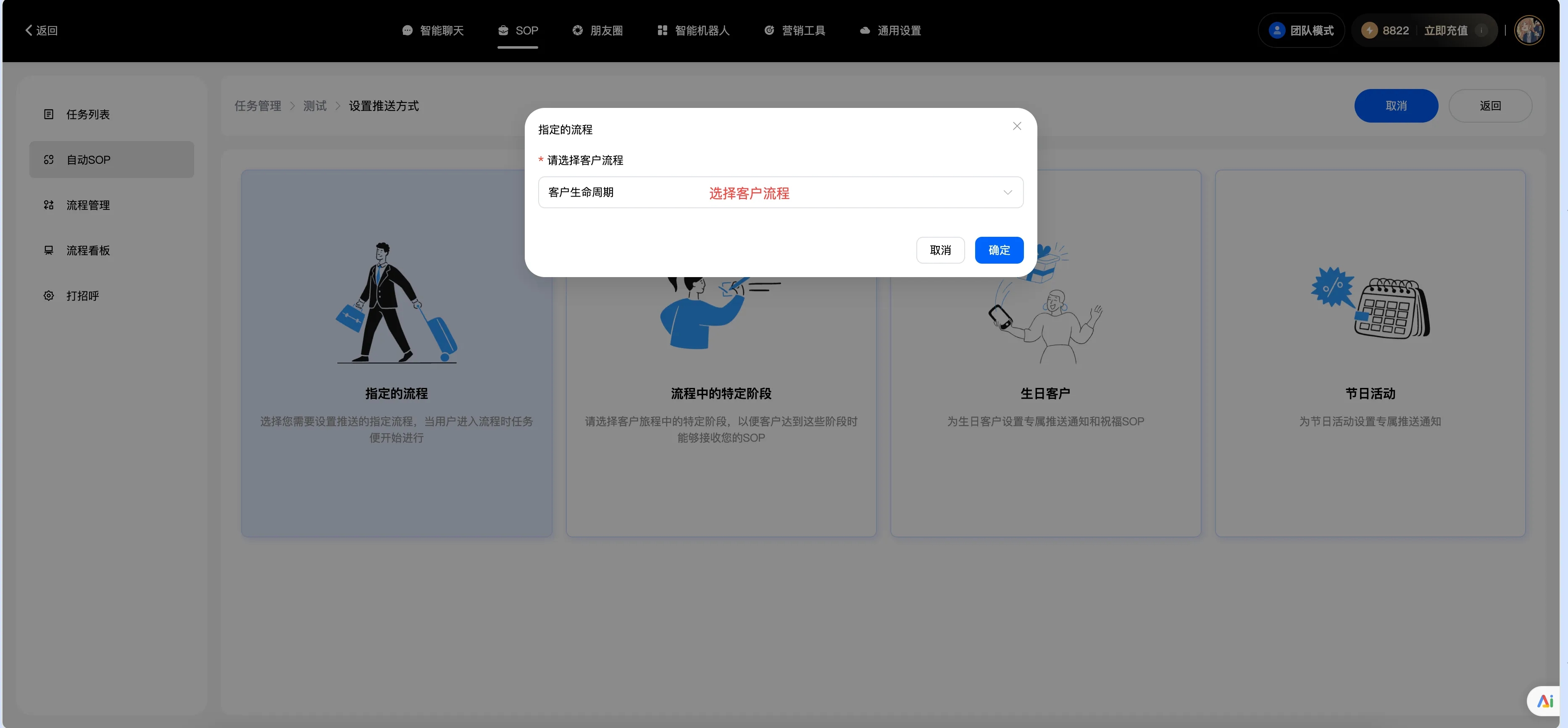 自动跟进:是指客户一直停留在某个阶段,比如说他来找你买东西,一直问你价格,但就是不付款,也就是他在询价阶段一直不进入付款阶段,系统识别到了,你就可以设置一个询问话术,他到时间就会告诉客户是不是不满意还是怎么了