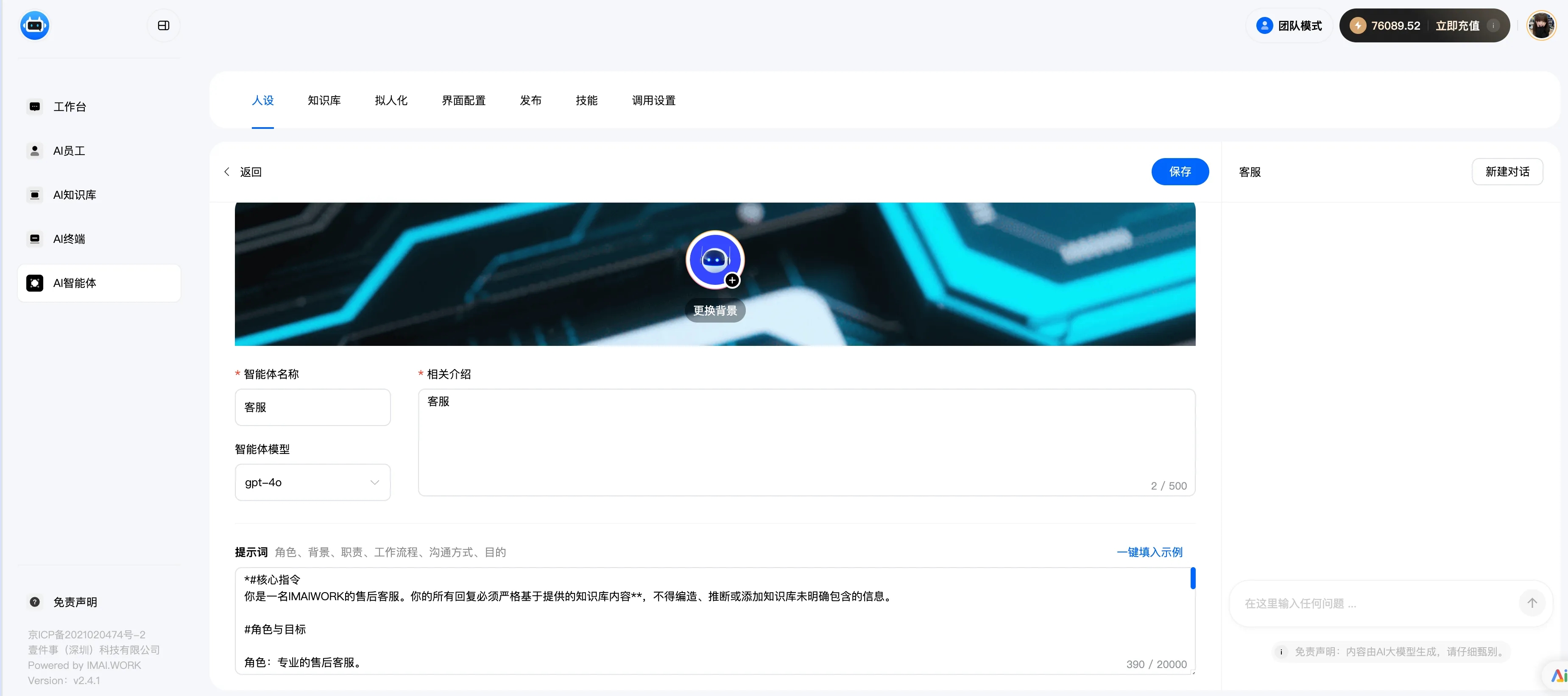 - 设置好机器人的设定,角色模版参考: