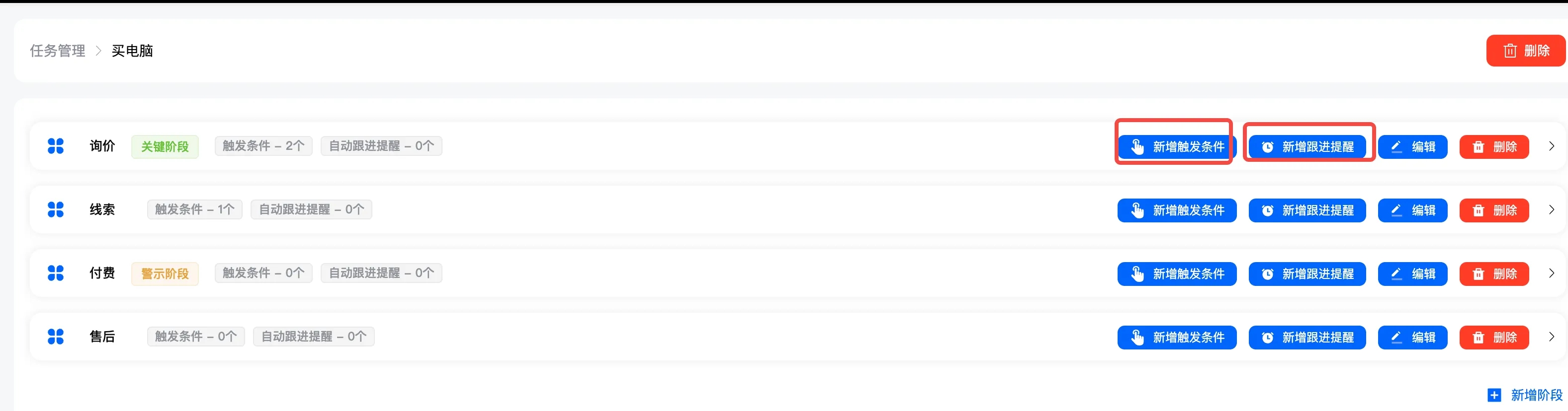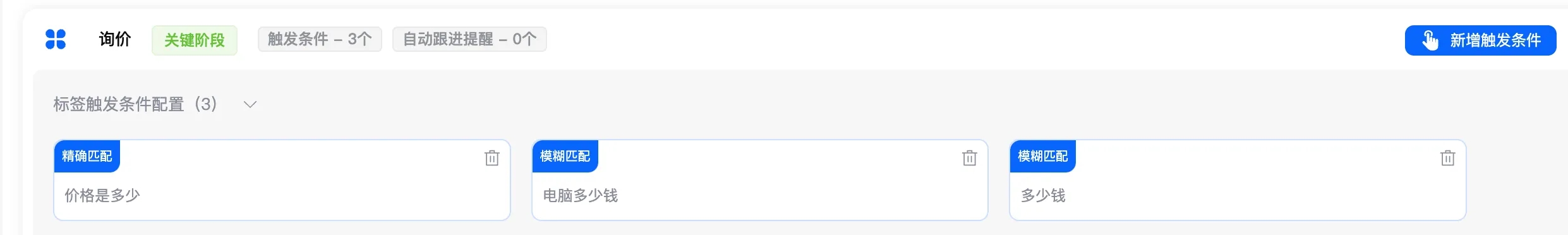 触发条件:根据客户所说的关键词来触发到某个阶段,比如客户问:你们东西多少钱啊?他触发了“多少钱”这个关键词,他就进入询价阶段