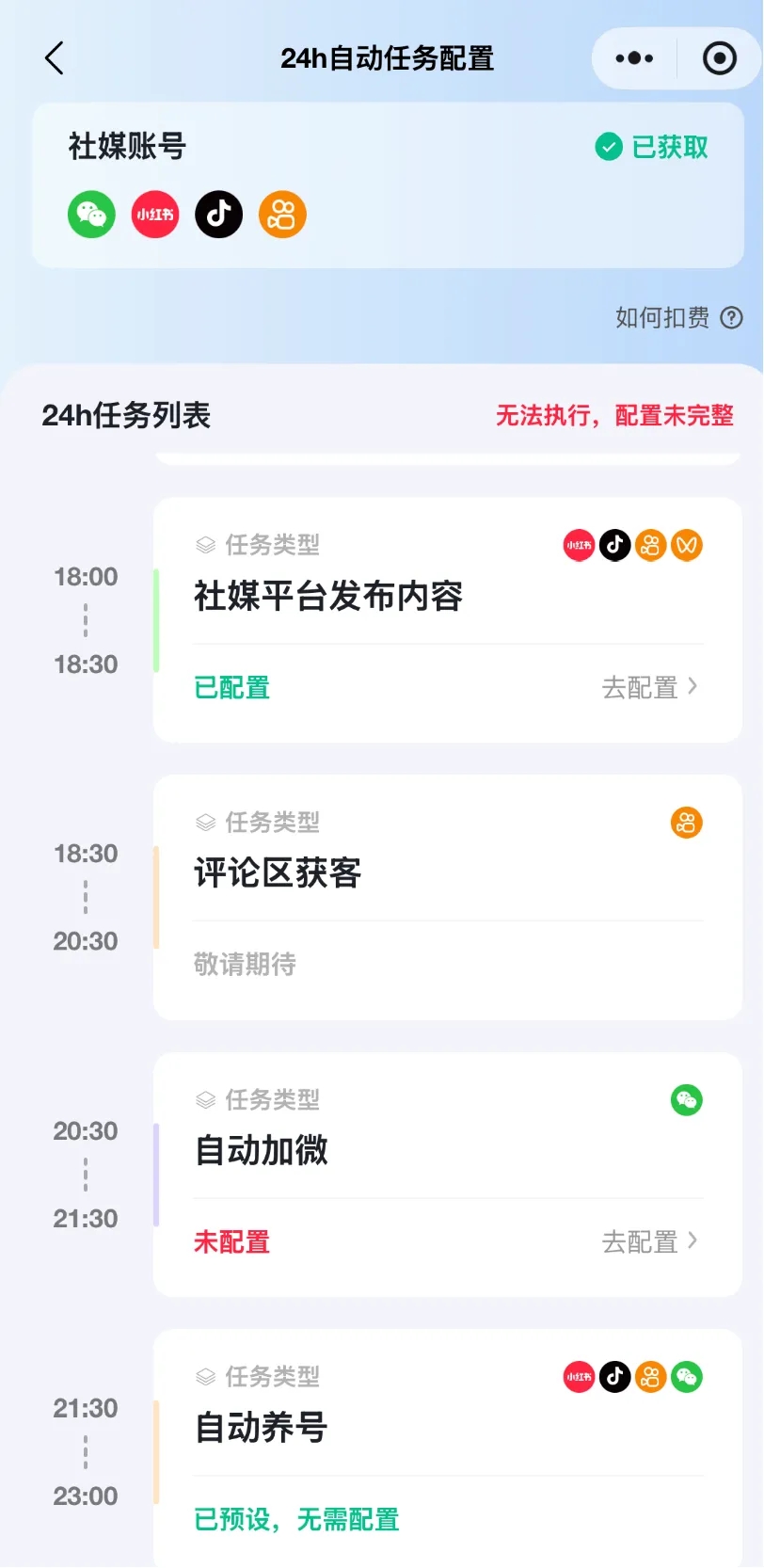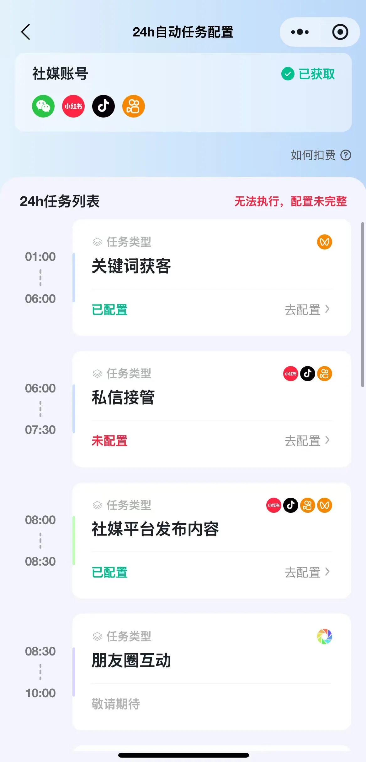 配置完成后会自动完成,关键词获客、社媒平台发布内容、自动养号的配置