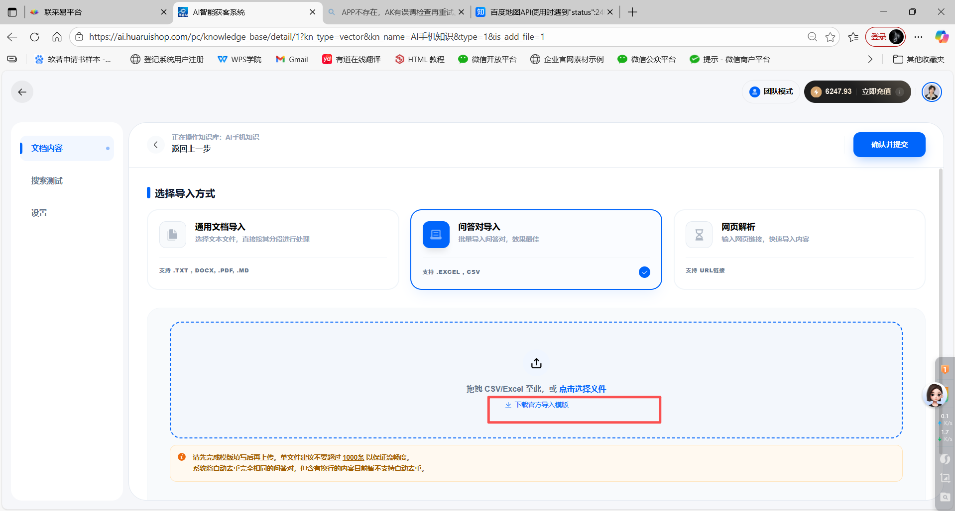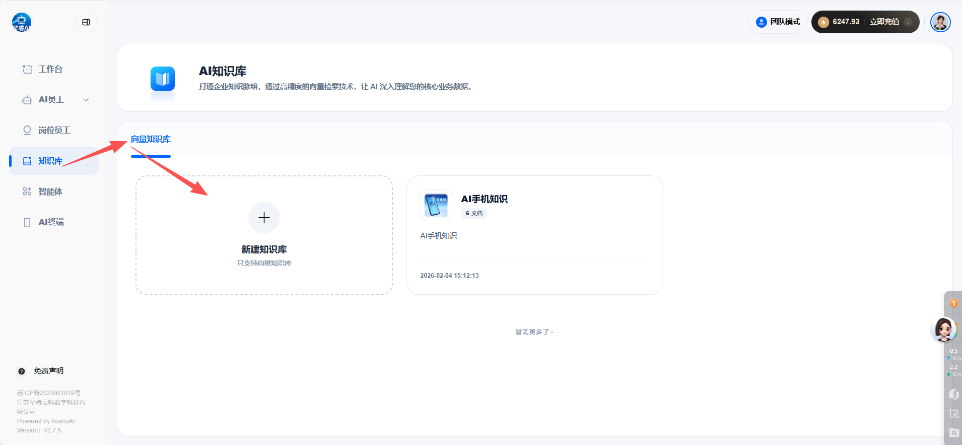目录 搜索 展开 首页目录一、功能介绍及配置AI手机软件介绍设置手机权限开启手机常亮二、手机相关功能使用AI获客 视频号获客开启之旅AI手机所有问题AI终端绑定问题AI销售AI销售如何使用 AI销售绑定问题 三、系统其他功能使用 24小时自动任务执行AI会议纪要AI知识库教程AI智能体智能体 coze智能体coze工作流 AI数字人 AI陪练AI人事 AI思维导图AI图片 暂无相关搜索结果! 阅读次数:11 本文档使用 MinDoc 发布 AI知识库教程 AI知识库教程向量知识库1.点击创建向量知识库2.填写相关描述3.添加文件4.创建您的文件,选择问答格式,下载我们的模版,根据模版来导入,选择完成提交即可作者:江苏华睿云科数字科技有限公司 创建时间:2026-01-26 11:21最后编辑:江苏华睿云科数字科技有限公司 更新时间:2026-02-11 16:41