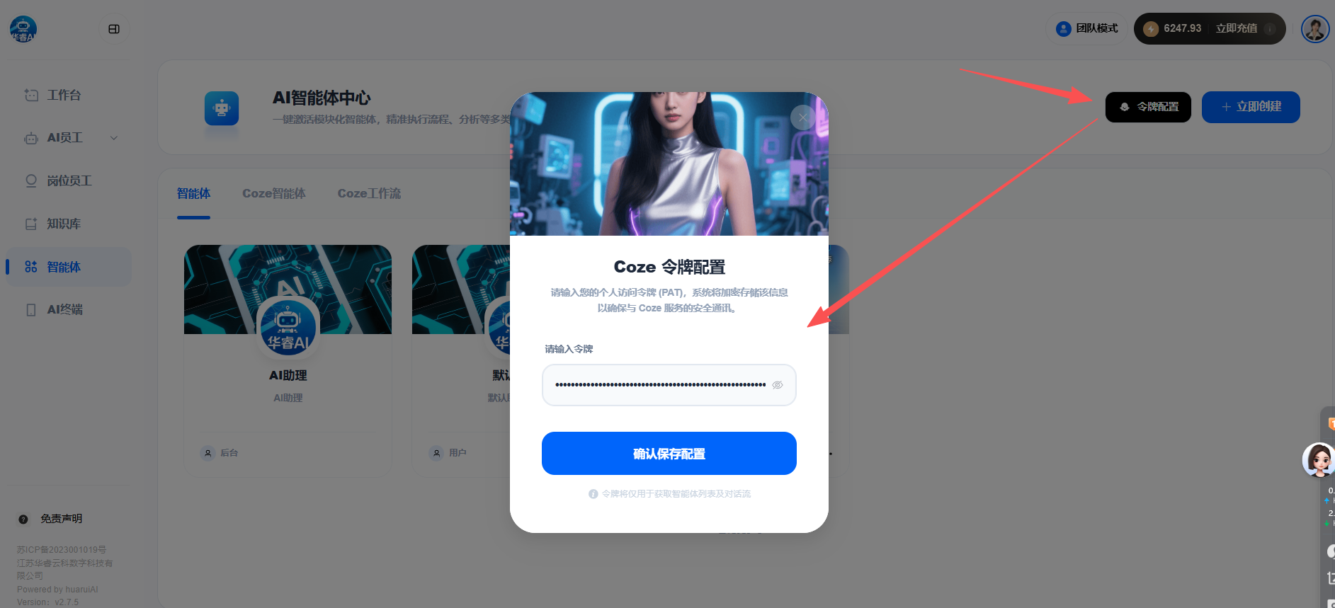 目录 搜索 展开 首页目录一、功能介绍及配置AI手机软件介绍设置手机权限开启手机常亮二、手机相关功能使用AI获客 视频号获客开启之旅AI手机所有问题AI终端绑定问题AI销售AI销售如何使用 AI销售绑定问题 三、系统其他功能使用 24小时自动任务执行AI会议纪要AI知识库教程AI智能体智能体 coze智能体coze工作流 AI数字人 AI陪练AI人事 AI思维导图AI图片 暂无相关搜索结果! 阅读次数:8 本文档使用 MinDoc 发布 AI智能体 AI智能体1.如何创建需要先输入令牌1.登录coze.cn,注册账号2.选择API管理————授权3.选择服务身份及凭证(长期授权)/个人访问令牌(短期授权)—-点击添加4.填写授权内容,如果不知道勾选什么,可以全选—复制令牌填写到我们的系统中作者:江苏华睿云科数字科技有限公司 创建时间:2026-01-26 11:22最后编辑:江苏华睿云科数字科技有限公司 更新时间:2026-02-11 16:41