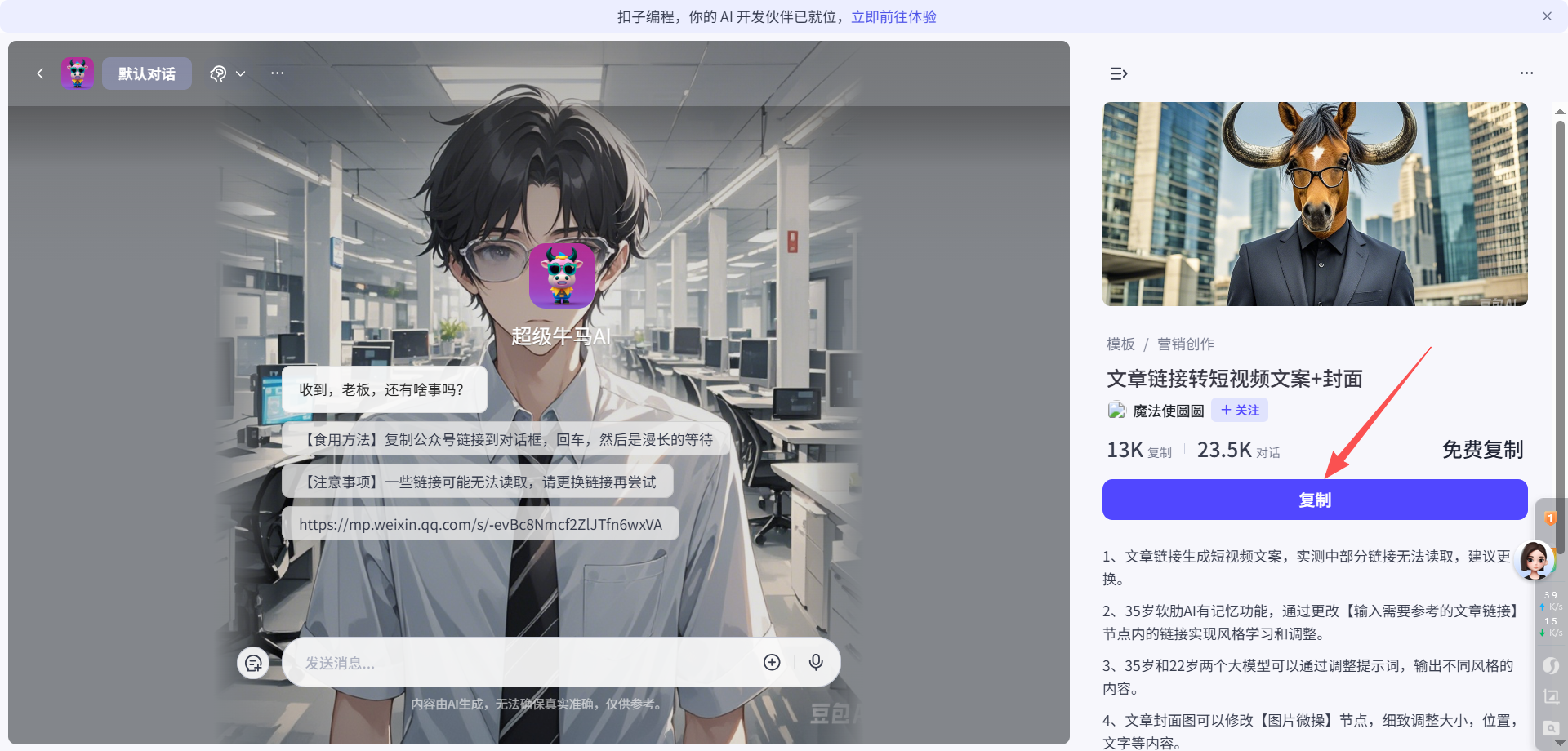 目录 搜索 展开 首页目录一、功能介绍及配置AI手机软件介绍设置手机权限开启手机常亮二、手机相关功能使用AI获客 视频号获客开启之旅AI手机所有问题AI终端绑定问题AI销售AI销售如何使用 AI销售绑定问题 三、系统其他功能使用 24小时自动任务执行AI会议纪要AI知识库教程AI智能体智能体 coze智能体coze工作流 AI数字人 AI陪练AI人事 AI思维导图AI图片 暂无相关搜索结果! 阅读次数:6 本文档使用 MinDoc 发布 coze智能体 coze智能体注意:智能体必须发布才可以使用!!!创建教程1.在coze的模版商店有许多模版,选择你想要的模版点击(注意查看是否是智能体)2.点击复制3.选择单Agent(对话流模式)4.点击发布5.打开您的URL,“bot/一串数字”这后面的这串数字就是ID作者:江苏华睿云科数字科技有限公司 创建时间:2026-01-26 11:23最后编辑:江苏华睿云科数字科技有限公司 更新时间:2026-02-11 16:41