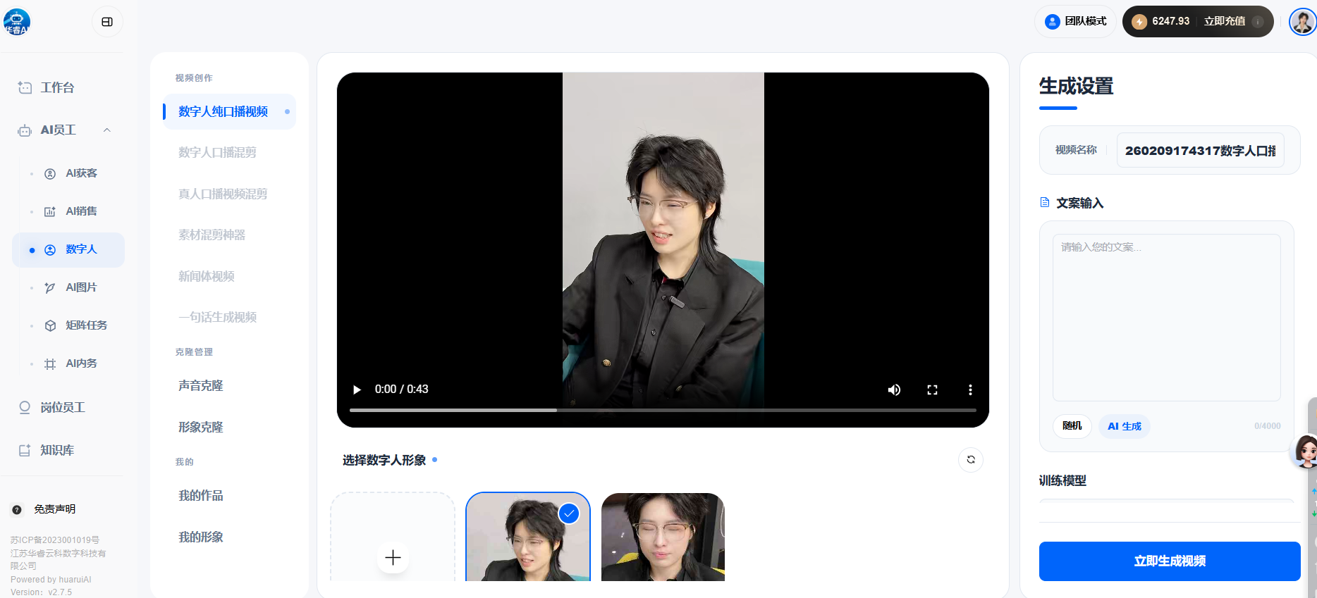 点击“创作六种视频”,选择“数字人纯口播视频”,选择你需要的数字人形象以及声音,打开AI智剪输入你想要的文案,可以随机生成文案或点击【智能文案】输入你的想法,让AI帮你编写文案。点击【生成视频】,稍等片刻可在【我的作品】中查看作品。