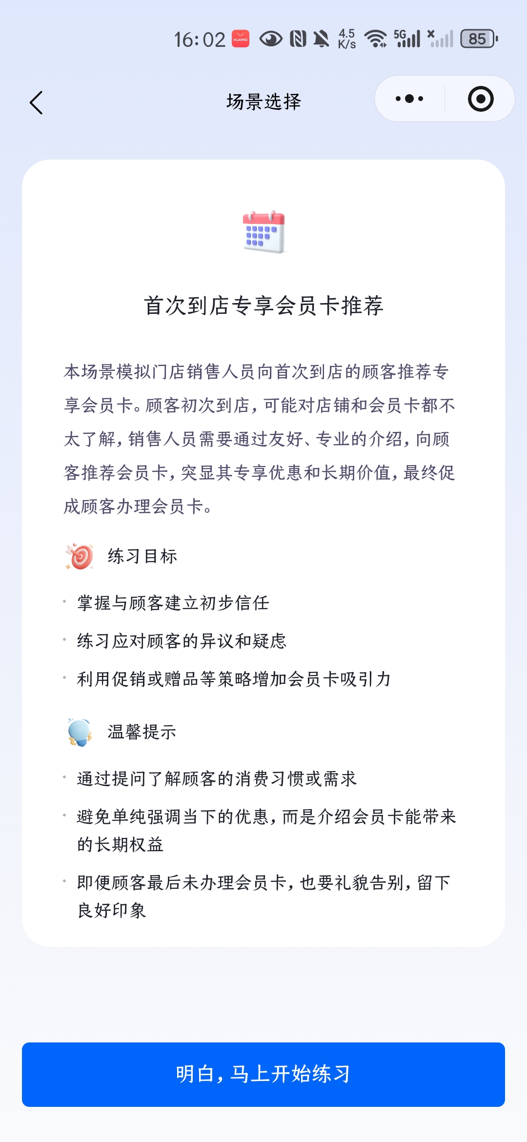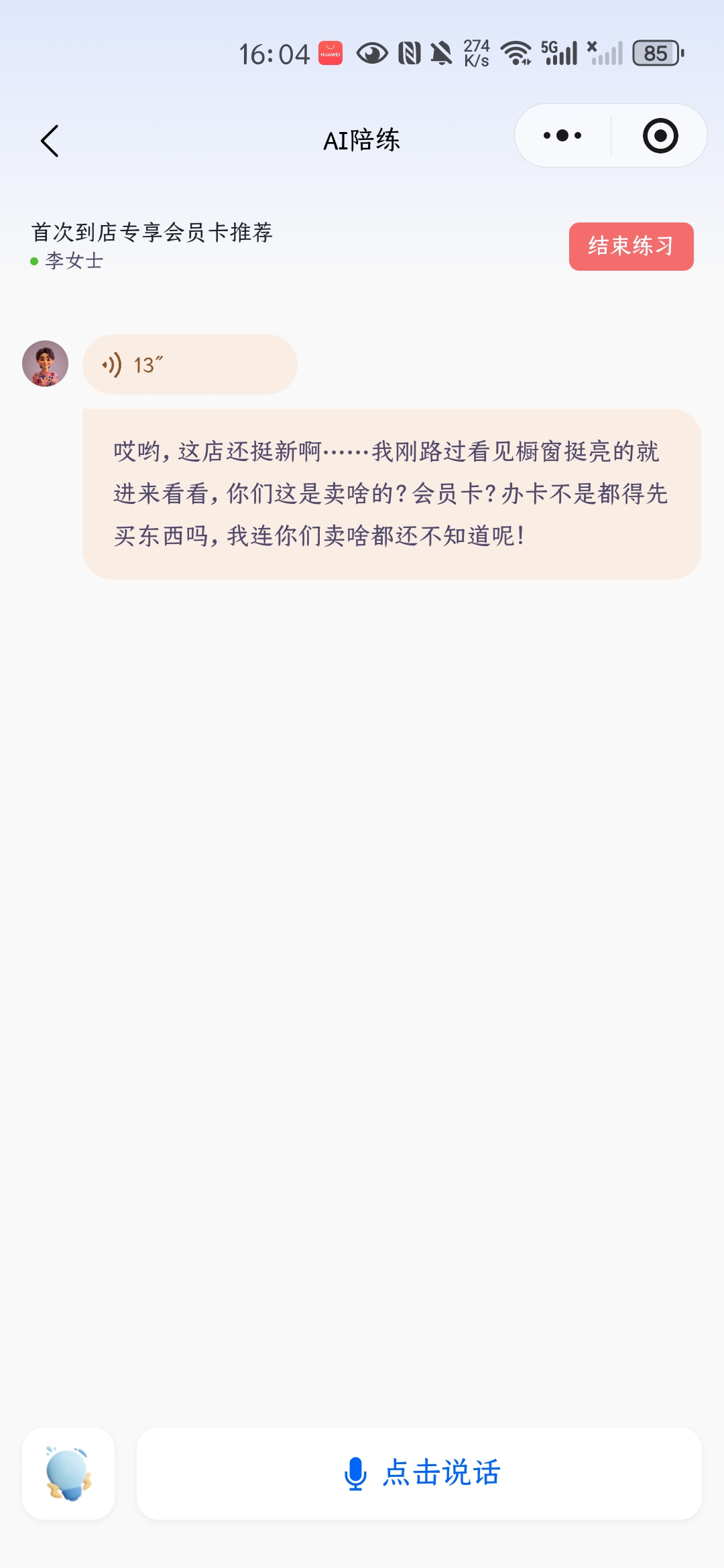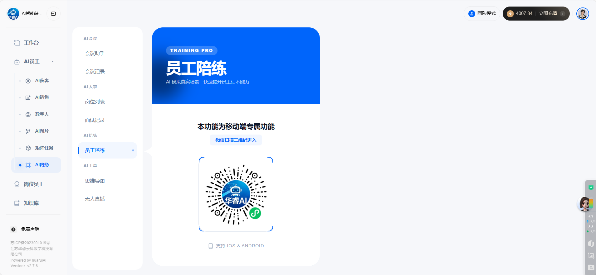 目录 搜索 展开 首页目录一、功能介绍及配置AI手机软件介绍设置手机权限开启手机常亮二、手机相关功能使用AI获客 视频号获客开启之旅AI手机所有问题AI终端绑定问题AI销售AI销售如何使用 AI销售绑定问题 三、系统其他功能使用 24小时自动任务执行AI会议纪要AI知识库教程AI智能体智能体 coze智能体coze工作流 AI数字人 AI陪练AI人事 AI思维导图AI图片 暂无相关搜索结果! 阅读次数:10 本文档使用 MinDoc 发布 AI陪练 AI陪练pc端:有小程序直接看下面,两个方式最终通向相同界面点击【AI员工-AI内务-员工陪练】,点击【立即使用】使用手机扫描弹出的二维码进入【智能陪练】界面小程序:点击【AI员工-AI内务】往下滑找到【智能陪练】点击进入即可。作者:江苏华睿云科数字科技有限公司 创建时间:2026-01-26 11:24最后编辑:江苏华睿云科数字科技有限公司 更新时间:2026-02-11 16:41