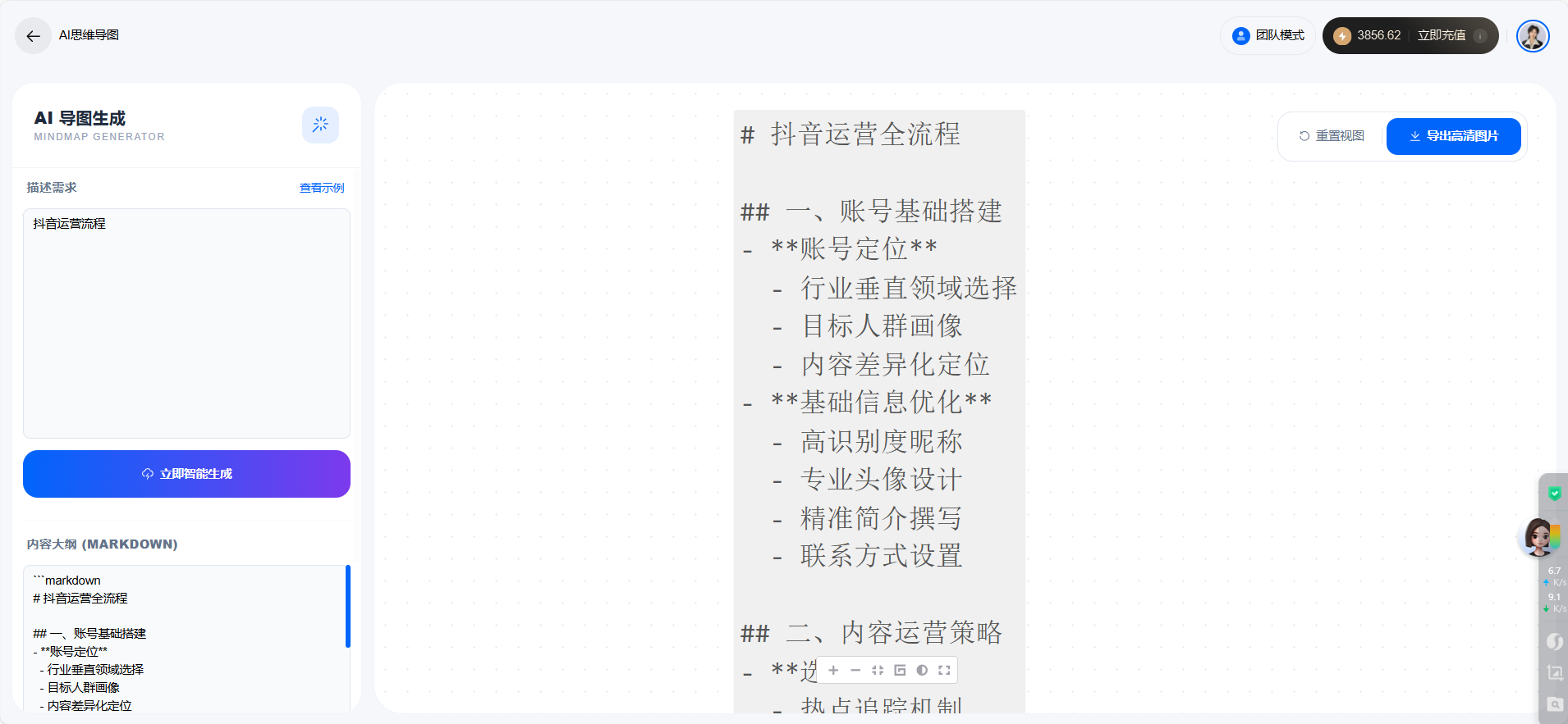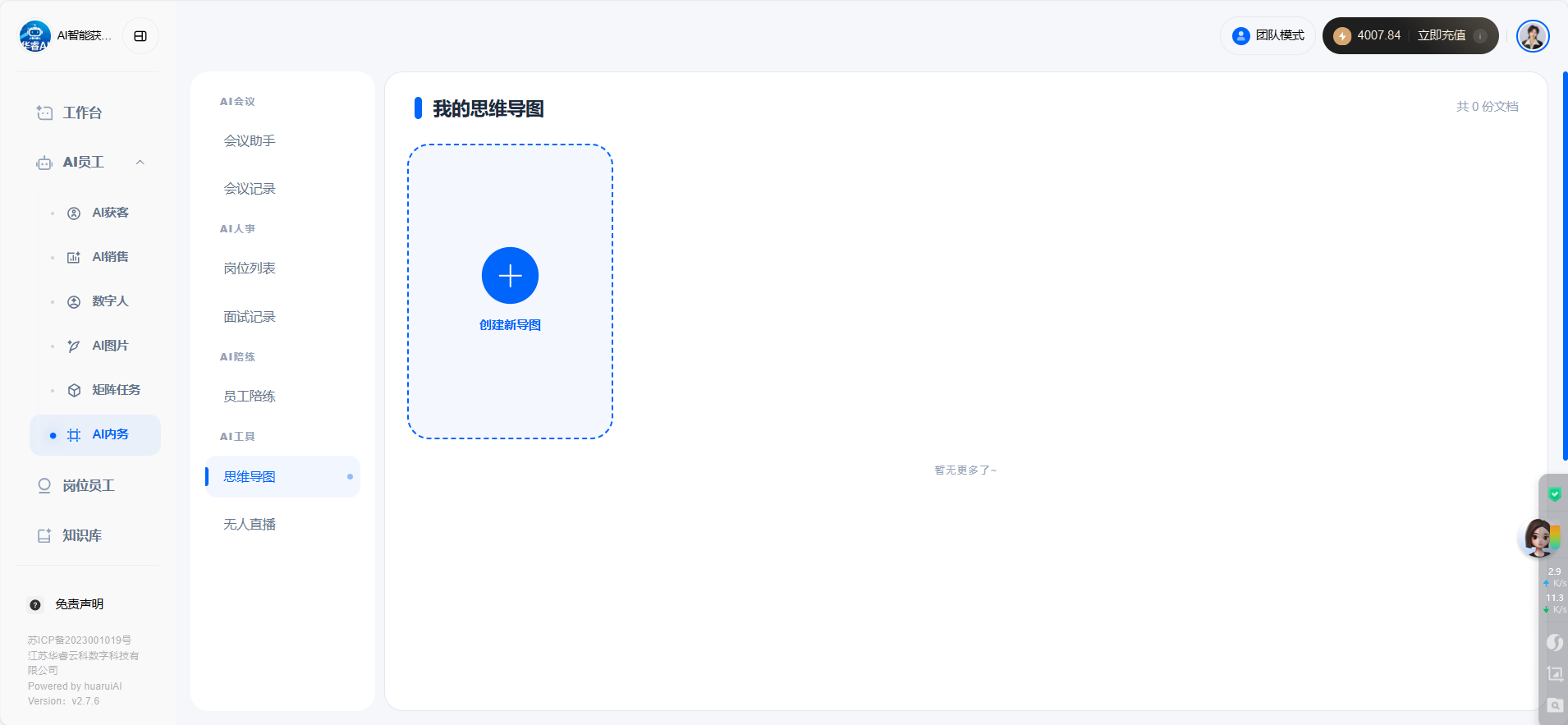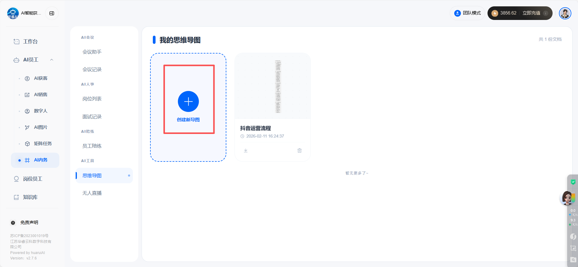 目录 搜索 展开 首页目录一、功能介绍及配置AI手机软件介绍设置手机权限开启手机常亮二、手机相关功能使用AI获客 视频号获客开启之旅AI手机所有问题AI终端绑定问题AI销售AI销售如何使用 AI销售绑定问题 三、系统其他功能使用 24小时自动任务执行AI会议纪要AI知识库教程AI智能体智能体 coze智能体coze工作流 AI数字人 AI陪练AI人事 AI思维导图AI图片 暂无相关搜索结果! 阅读次数:9 本文档使用 MinDoc 发布 AI思维导图 AI思维导图步骤一:打开【AI思维导图】步骤二:点击新增思维导图步骤三:输入自己想要的内容可以参考下方示例,点击试试示例点击导出思维导图即可。作者:江苏华睿云科数字科技有限公司 创建时间:2026-01-26 11:26最后编辑:江苏华睿云科数字科技有限公司 更新时间:2026-02-11 16:41