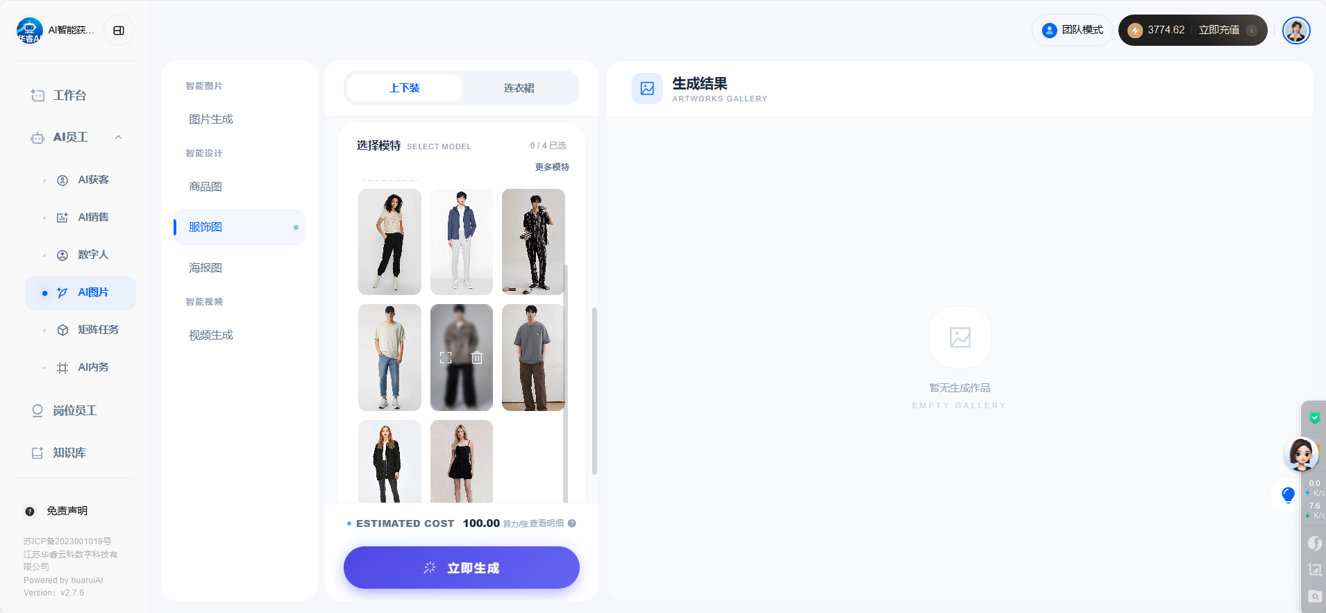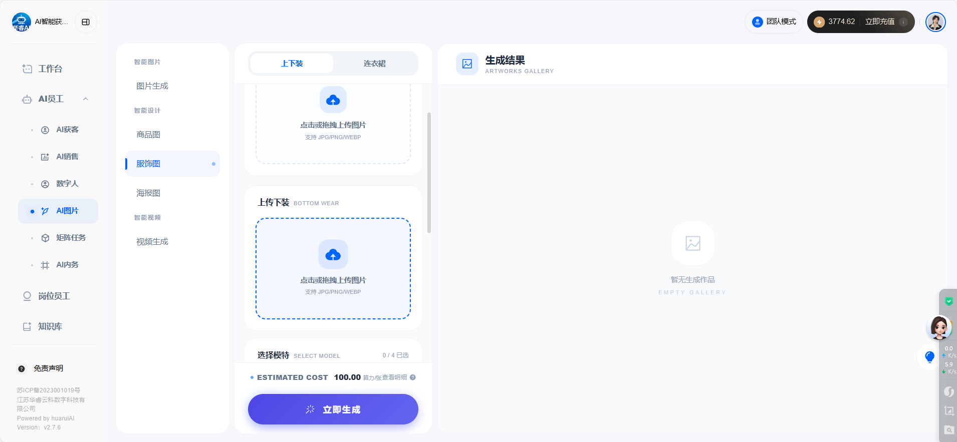 您可以自己上传模特图,也可以使用我们自带的 选择好后点击立即生成