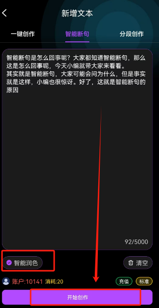 输入一段文字,智能断句会自动把文字扩充,并且自动分段