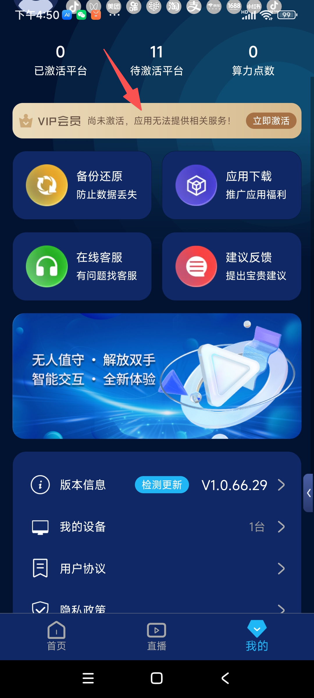 3.登录进App后,进入激活页面、输入激活码完成激活。(激活卡密需要向客服获取)