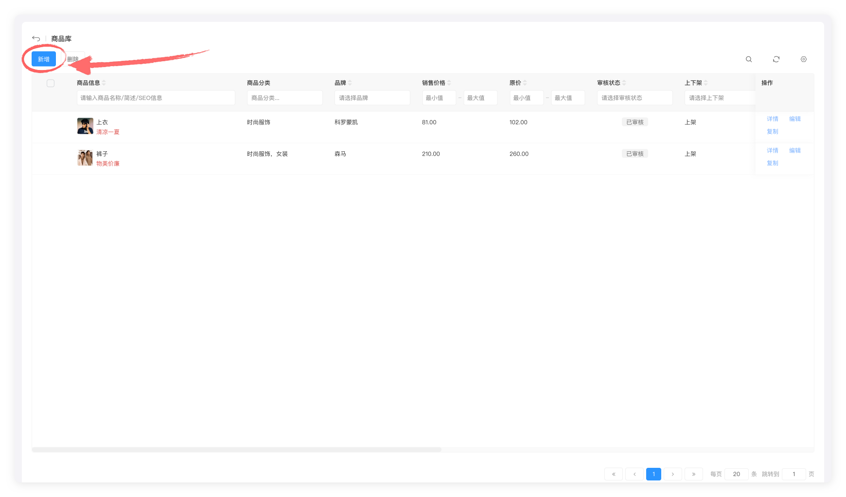 2.进入商品库页面,点击新增按钮。