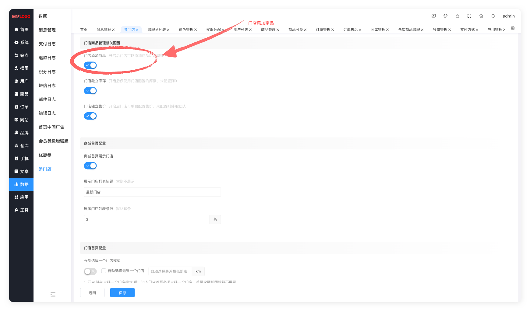 应用 → 应用管理 → 多门店 → 基础配置 → 开启/关闭门店添加商品