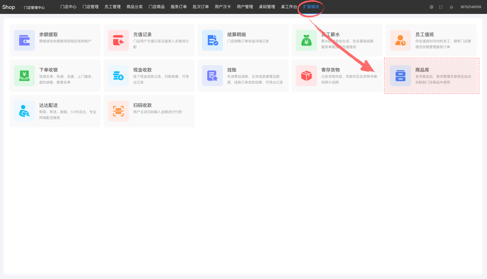 2.当开关开启时,进入门店管理中心,选择顶部导航中的扩展模块,进入扩展模块模块页面,点击商品库,进入商品库页面,点击新增可添加商品。