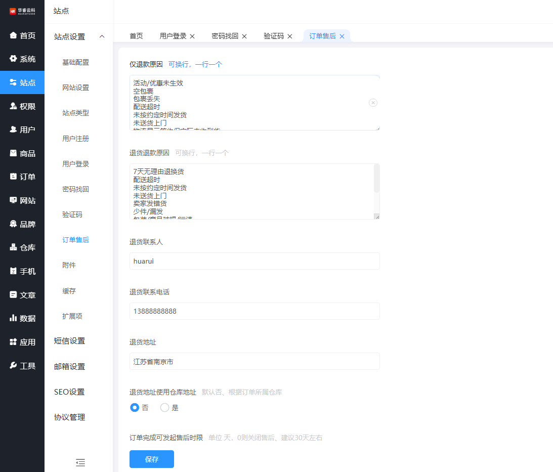 退款原因配置,退货原因配置,退货地址,退货仓库控制,退货周期