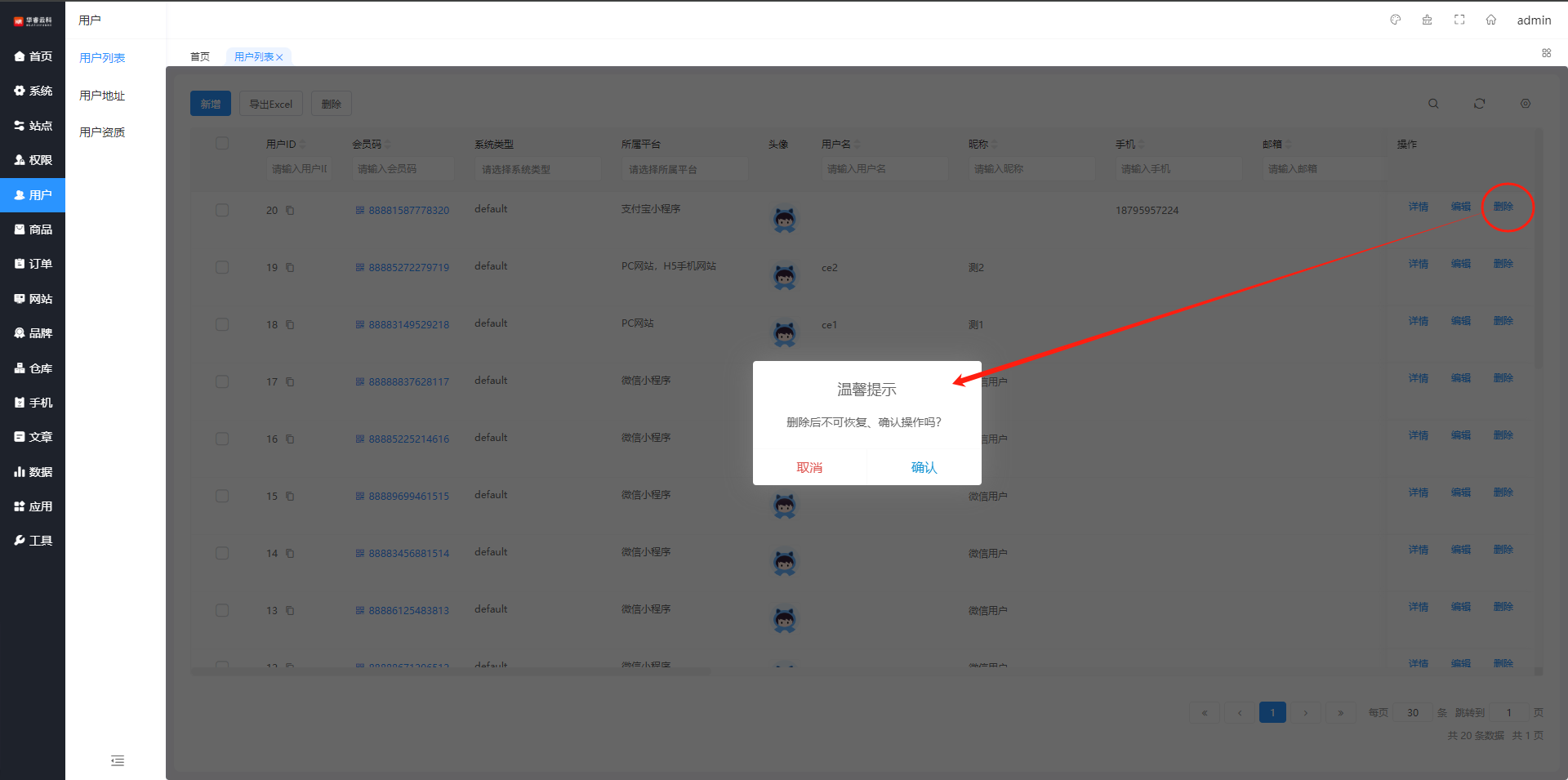 选择需要删除的用户,点击右侧操作栏【删除】按钮;可进行用户的删除操作,如图所示: