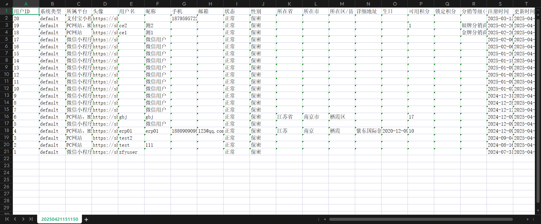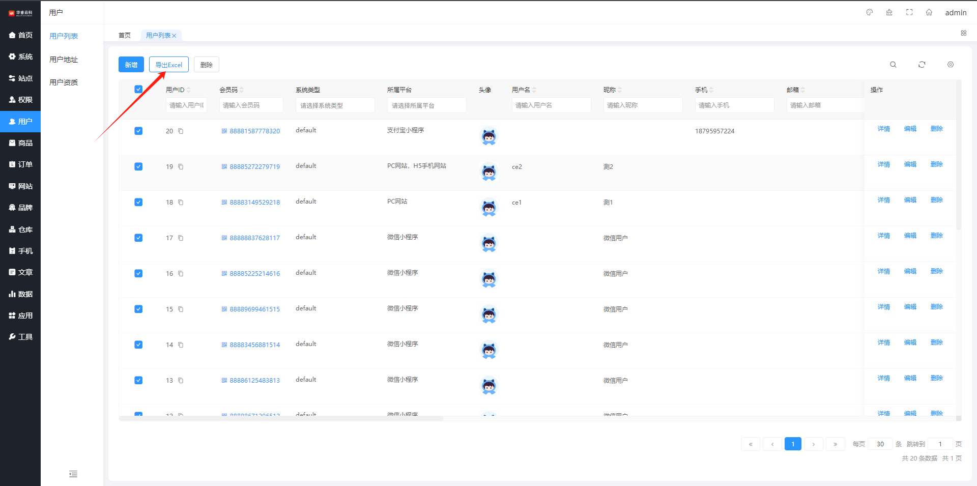 点击用户列表页的【导出】按钮,可以实现用户列表导出功能。具体如下: