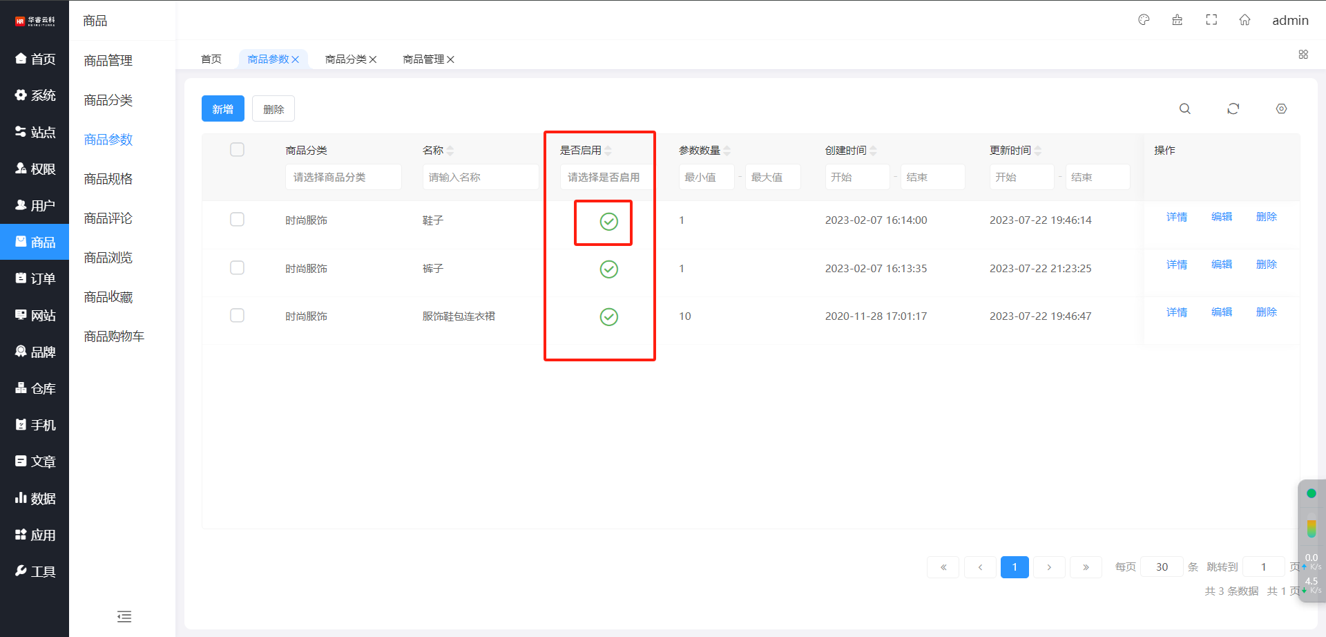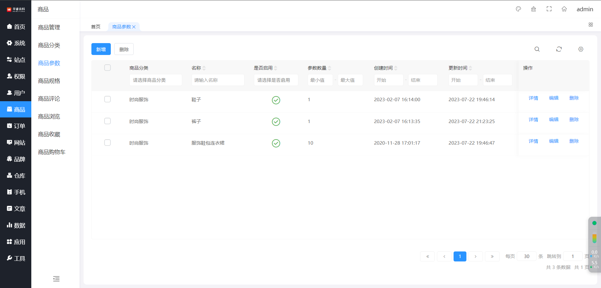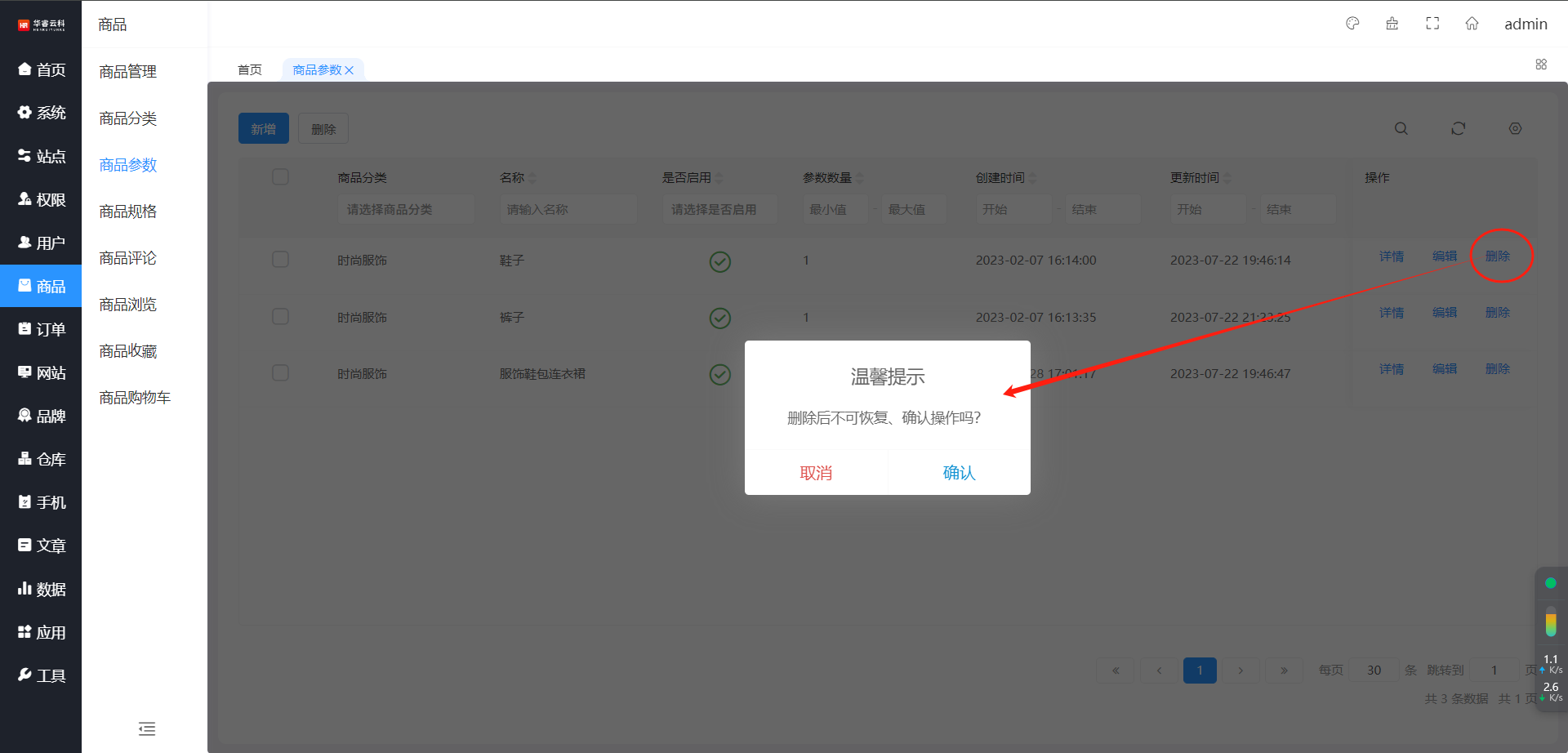在商品参数管理页面,点击分类列表右侧的【删除】按钮,弹出删除参数的确认弹窗,点击确定,删除成功,如图所示:
