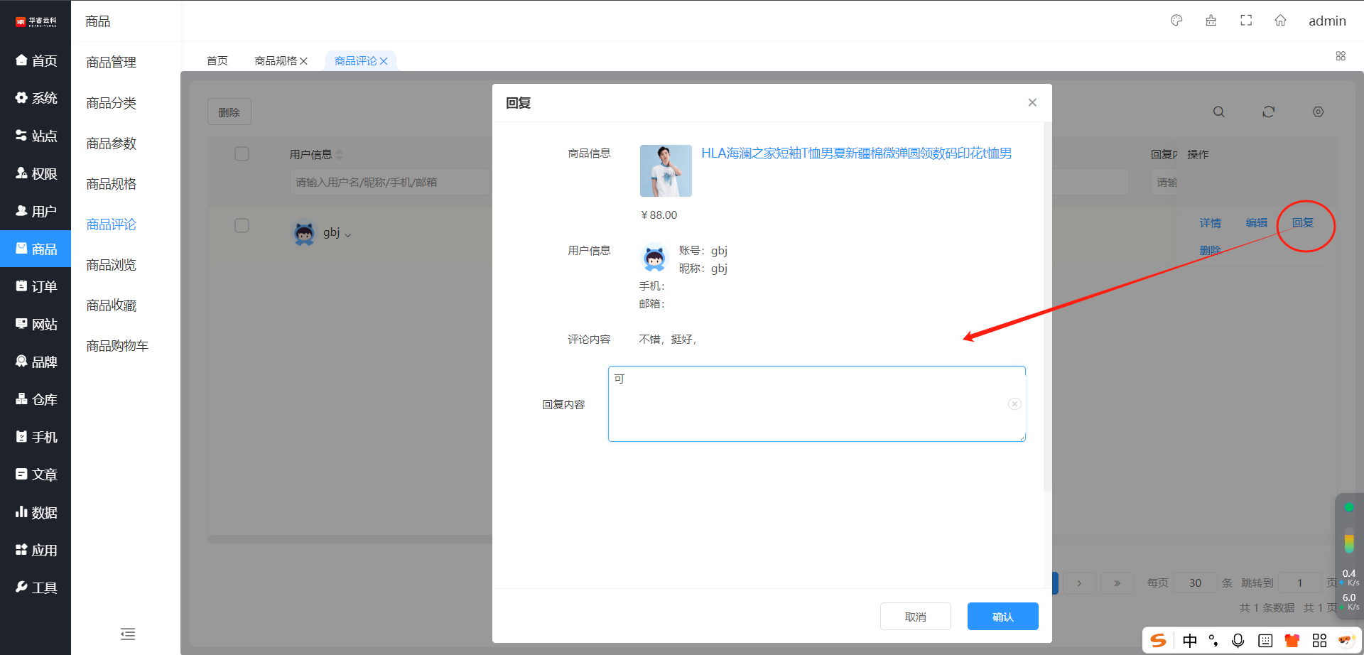 选择需要回复的评论,点击右侧操作栏【回复】按钮,回复商品评论信息,如图所示: