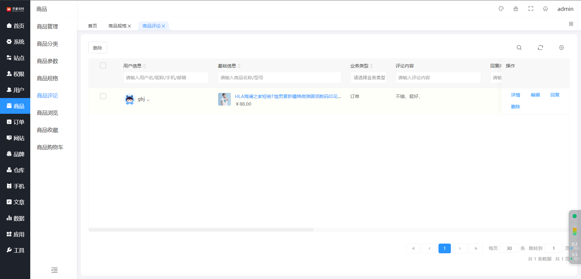 选择需要查看的商品评论,点击右侧操作栏【详情】按钮,查看商品评论信息,如图所示: