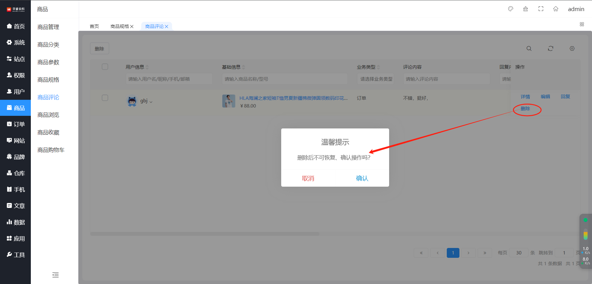 在评论列表页面,点击评论列表右侧的【删除】按钮,弹出确认删除的提示弹窗,如图所示: