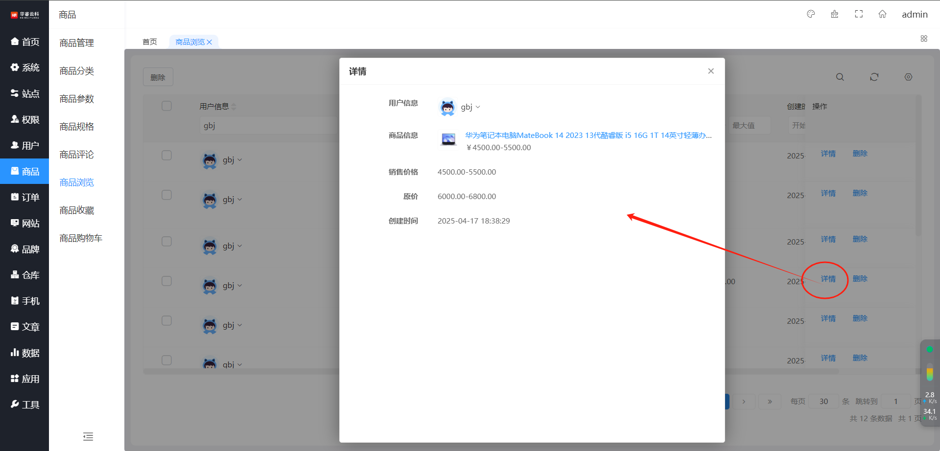 选择需要查看的商品浏览数据,点击右侧操作栏【详情】按钮,查看商品浏览信息,如图所示: