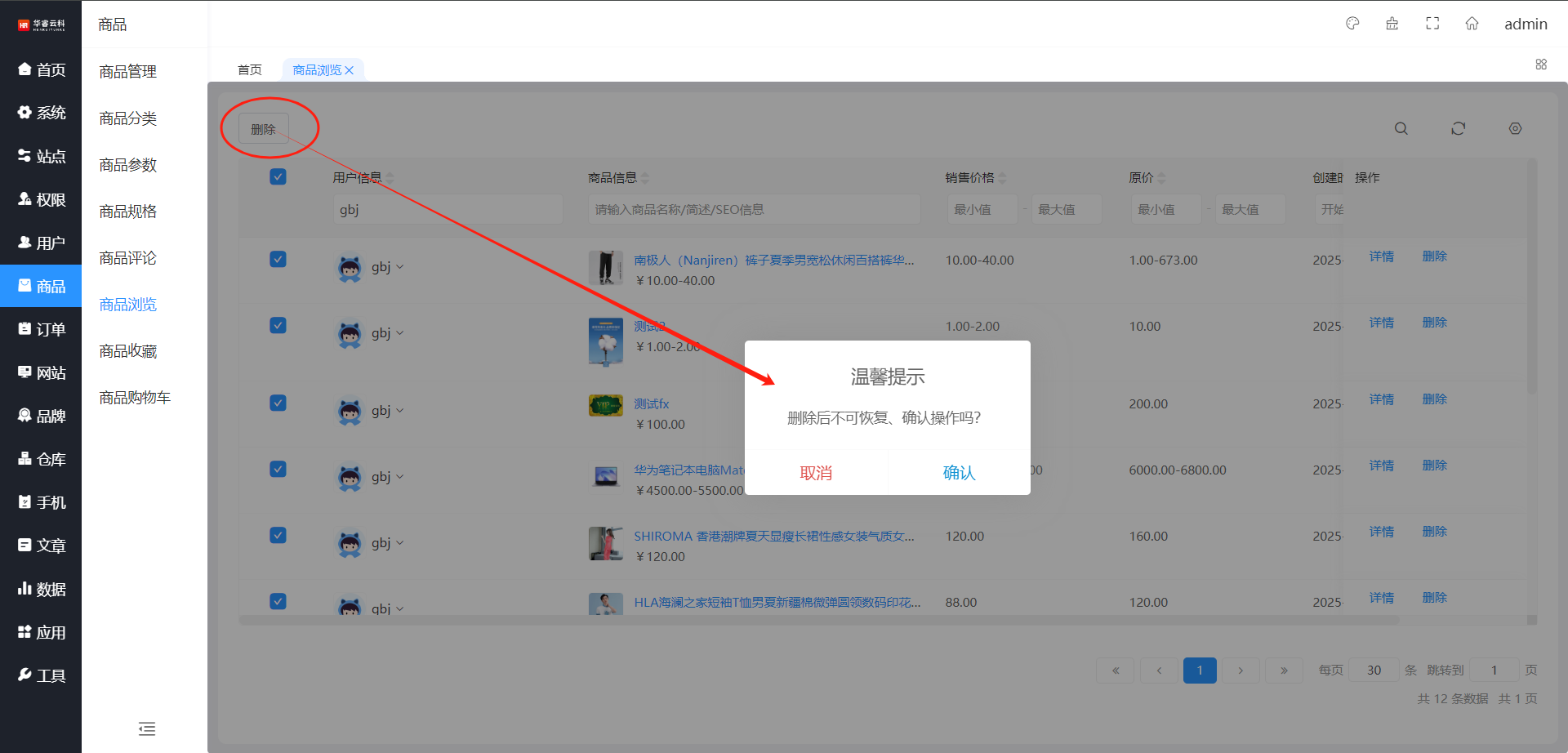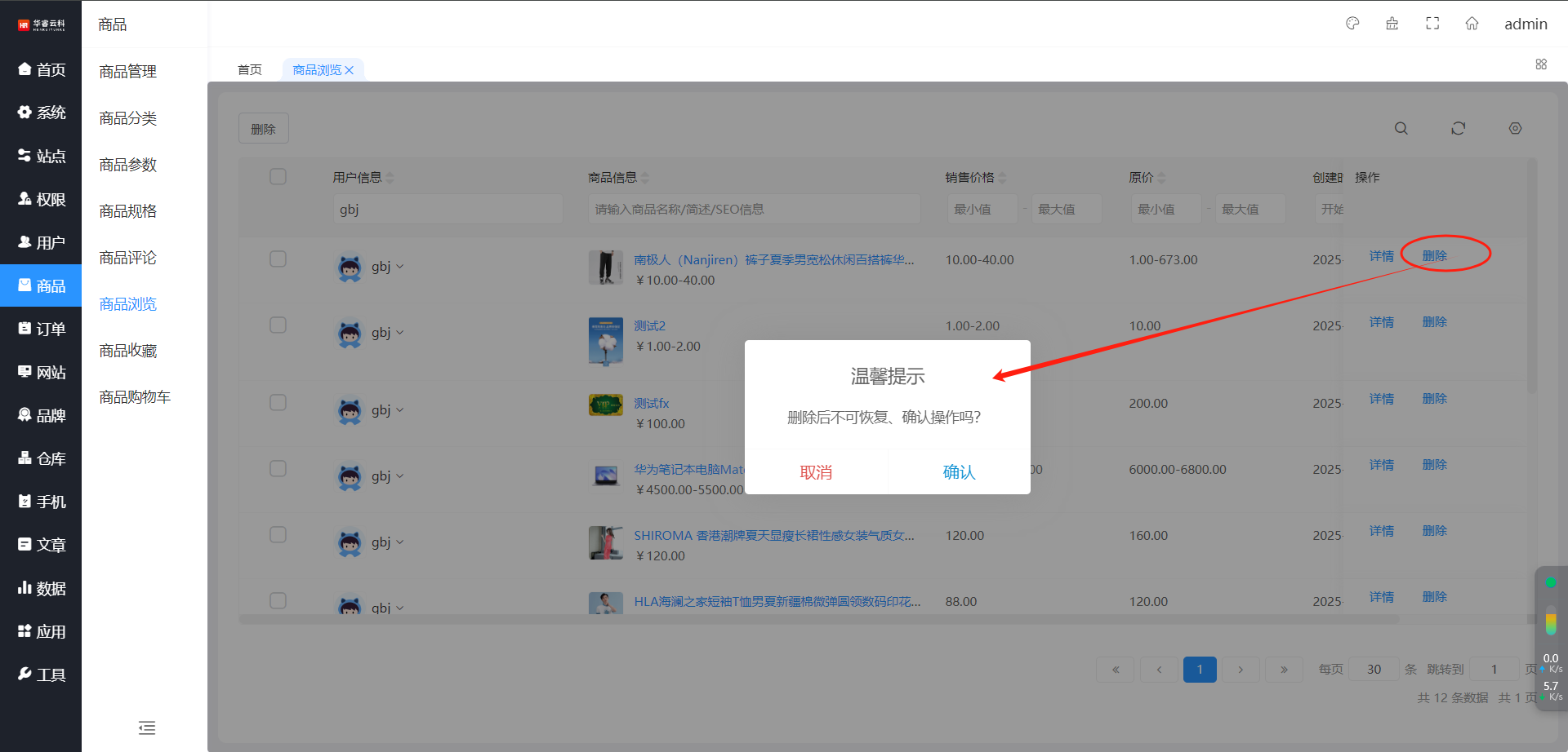 在商品浏览列表页面,点击列表右侧的【删除】按钮,弹出确认删除的提示弹窗,如图所示: