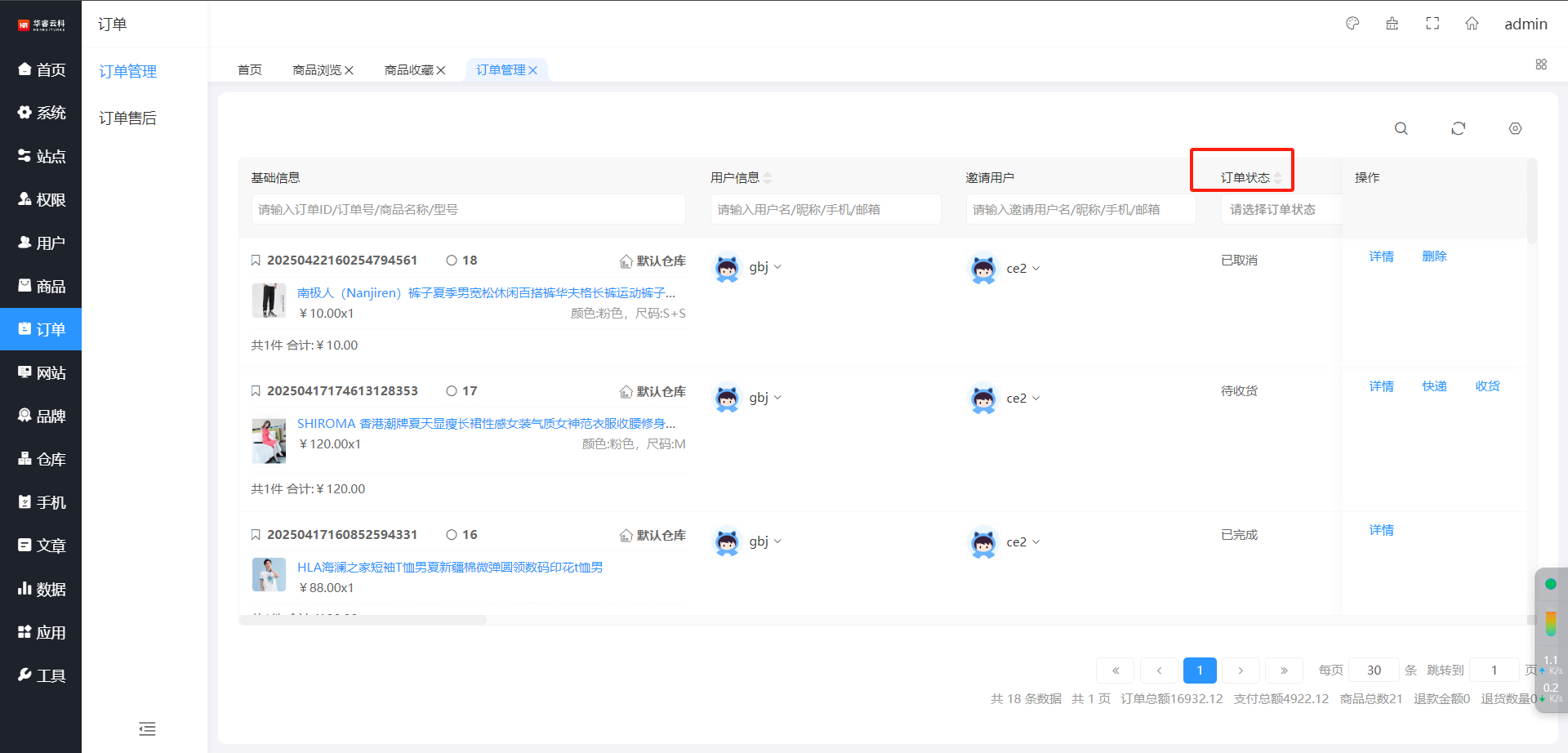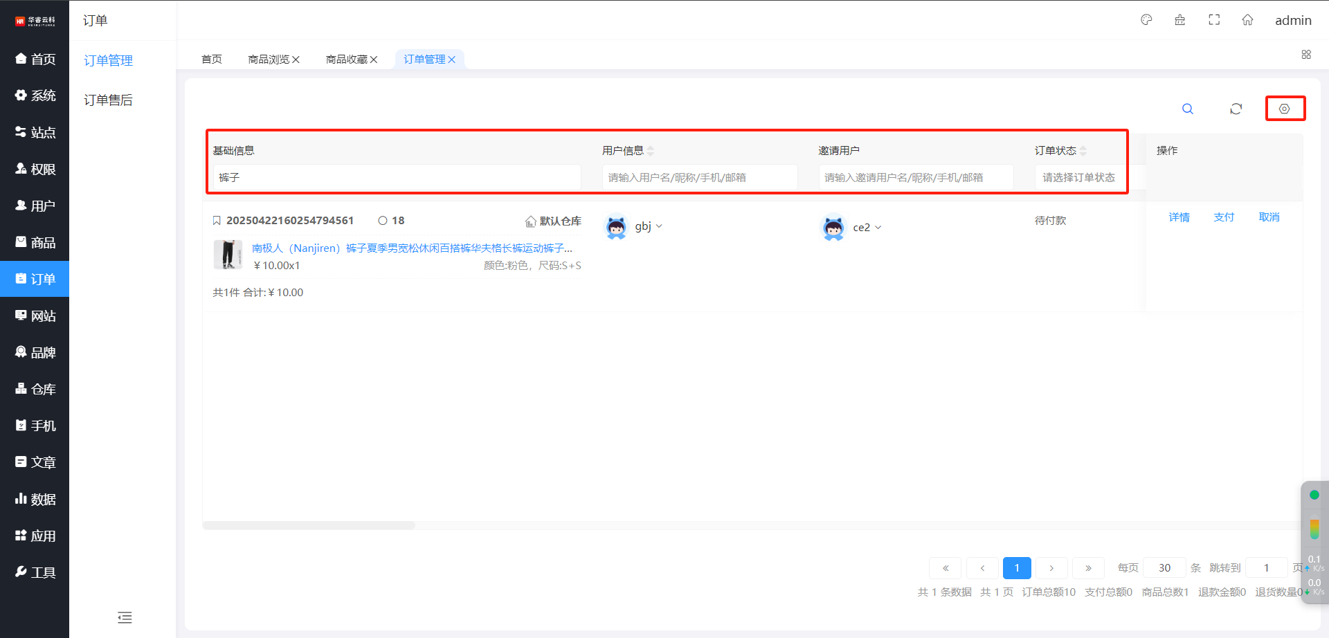 在订单列表页面,通过用户信息、商品信息、订单状态等查询,筛选条件可自定义勾选设置,如图所示: