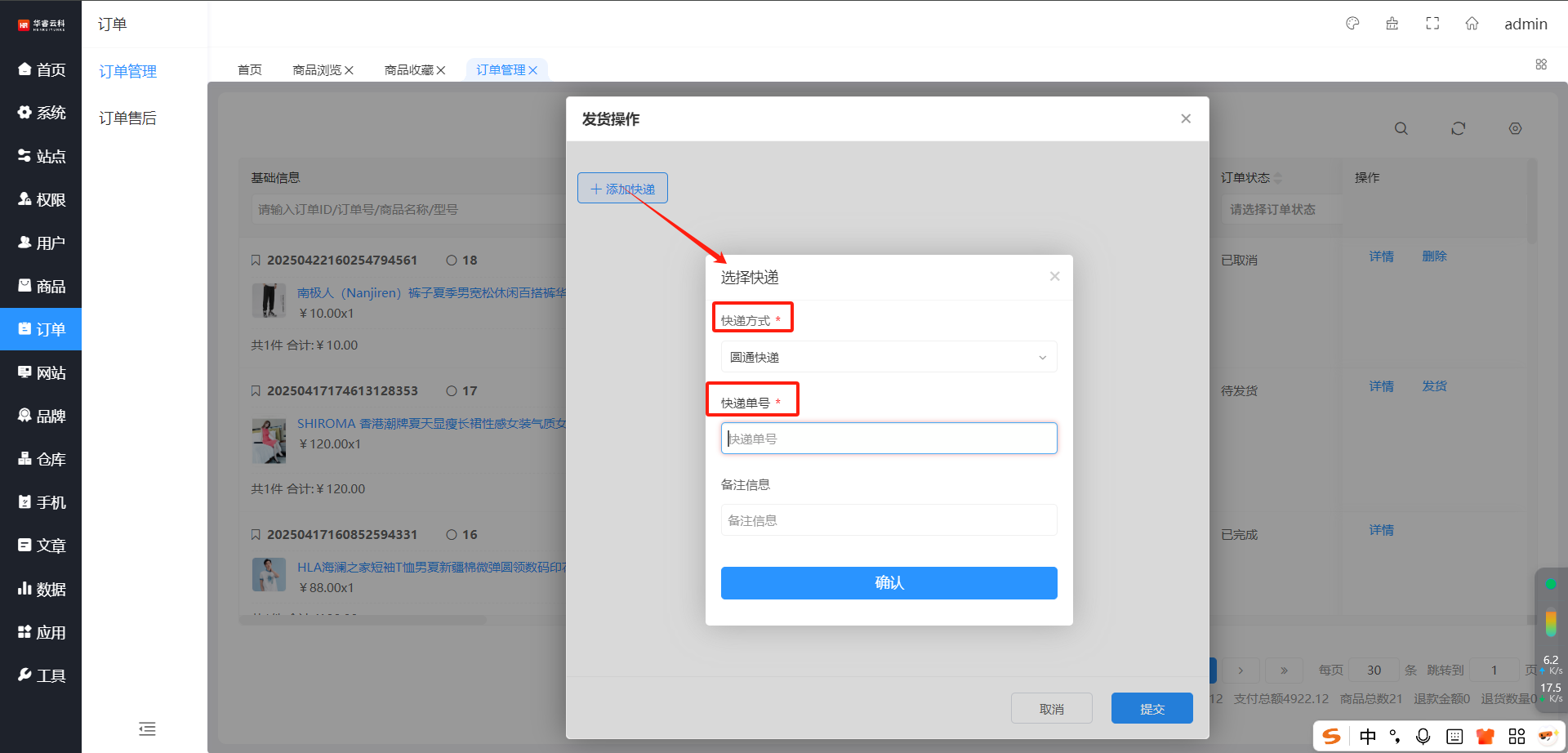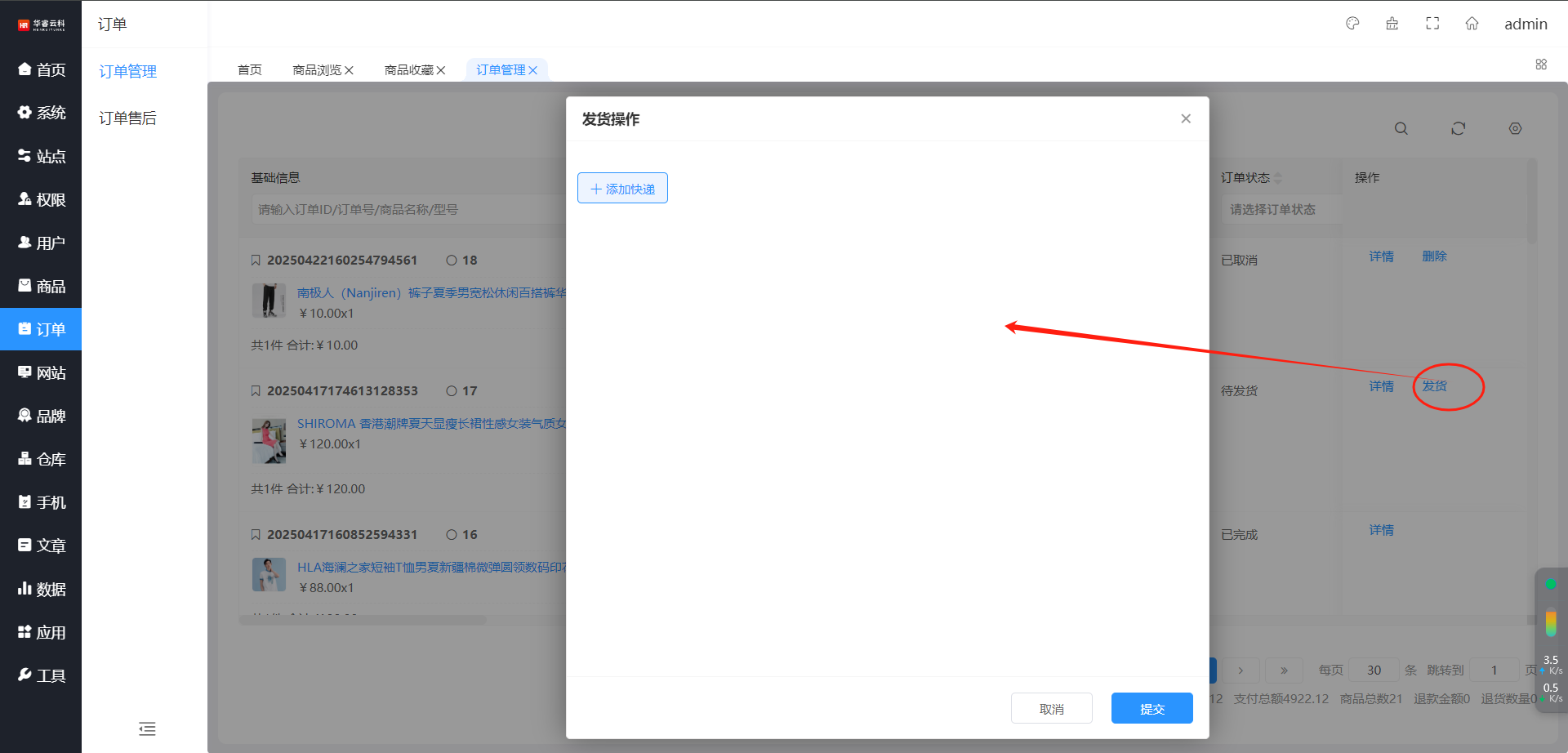 在订单列表页面,待发货的订单 点击列表右侧的【发货】按钮,如图所示: