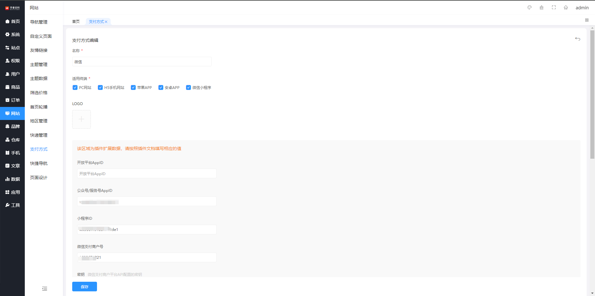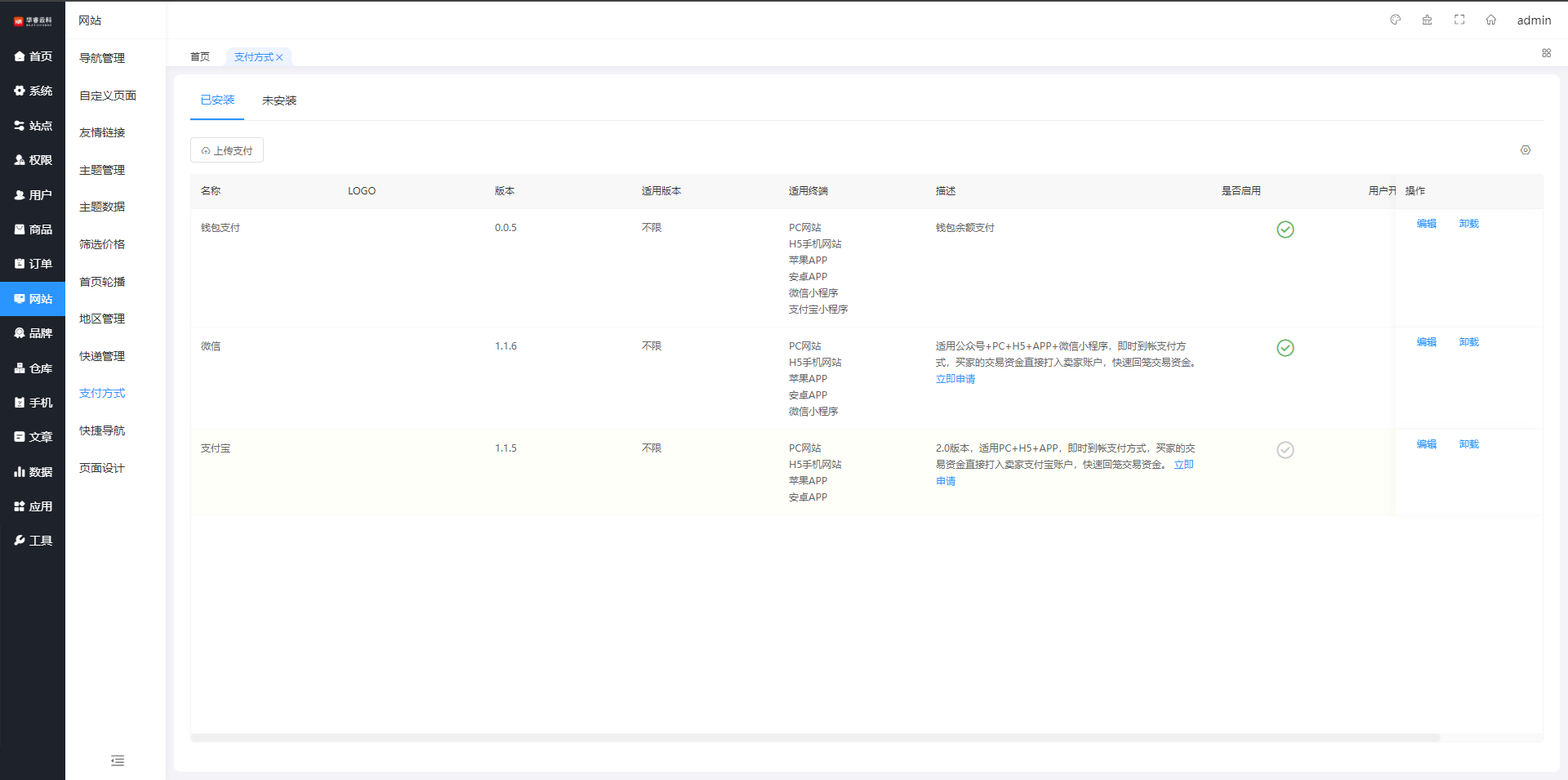 支付方式管理,可以添加,微信支付,支付宝银联等等支付方式管理