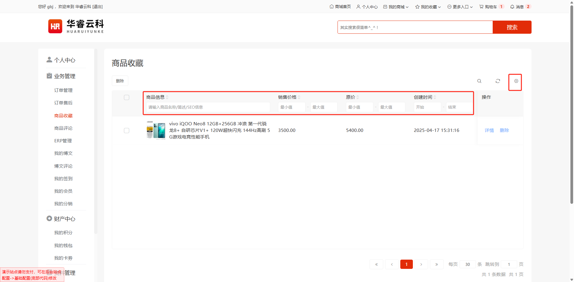 可根据商品名称、简述、SEO信息、原价区间等进行筛选,筛选条件可自定义勾选设置
