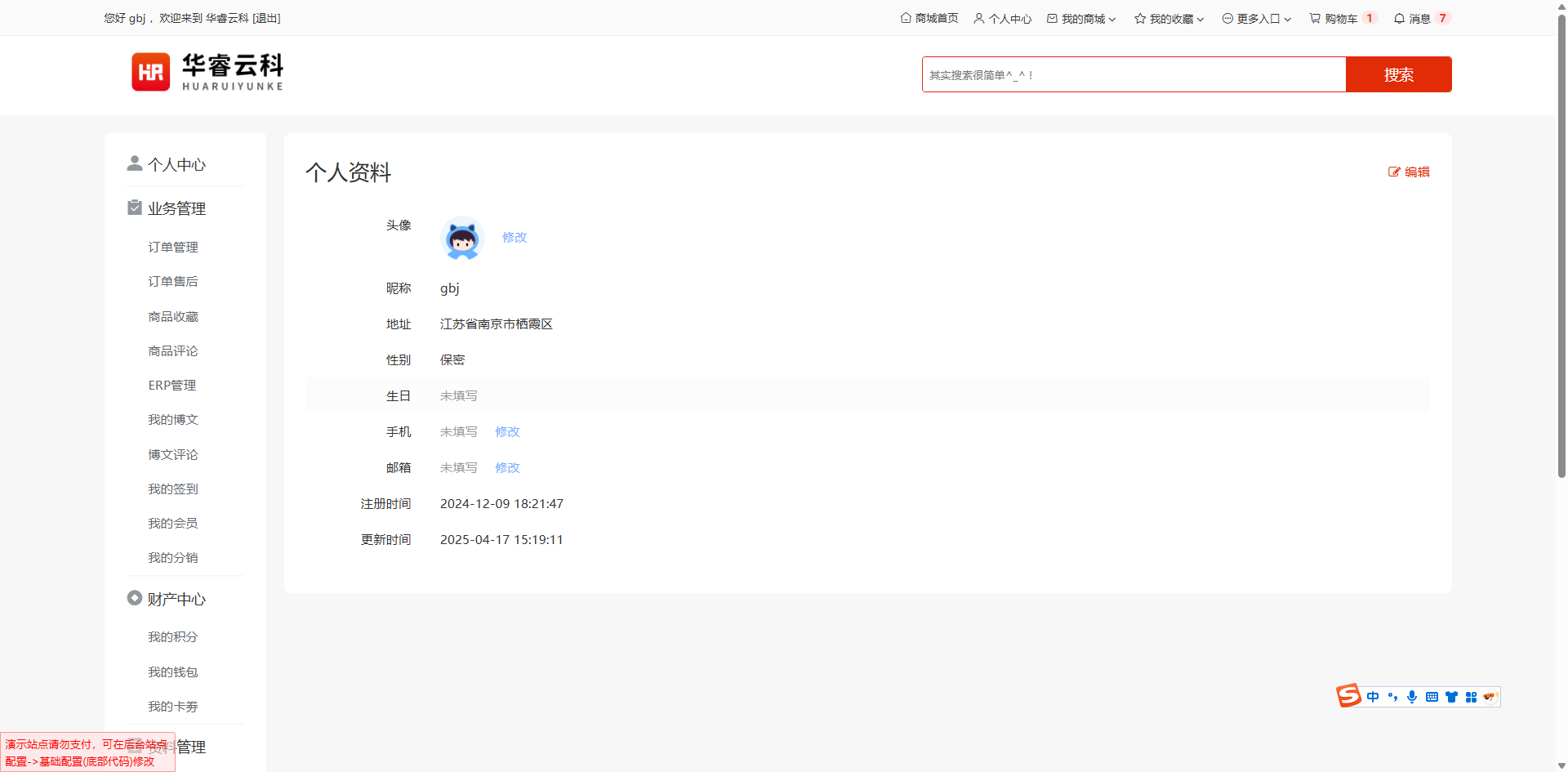 用户头像、昵称、生日、详细地址、性别设置、绑定手机、绑定邮箱