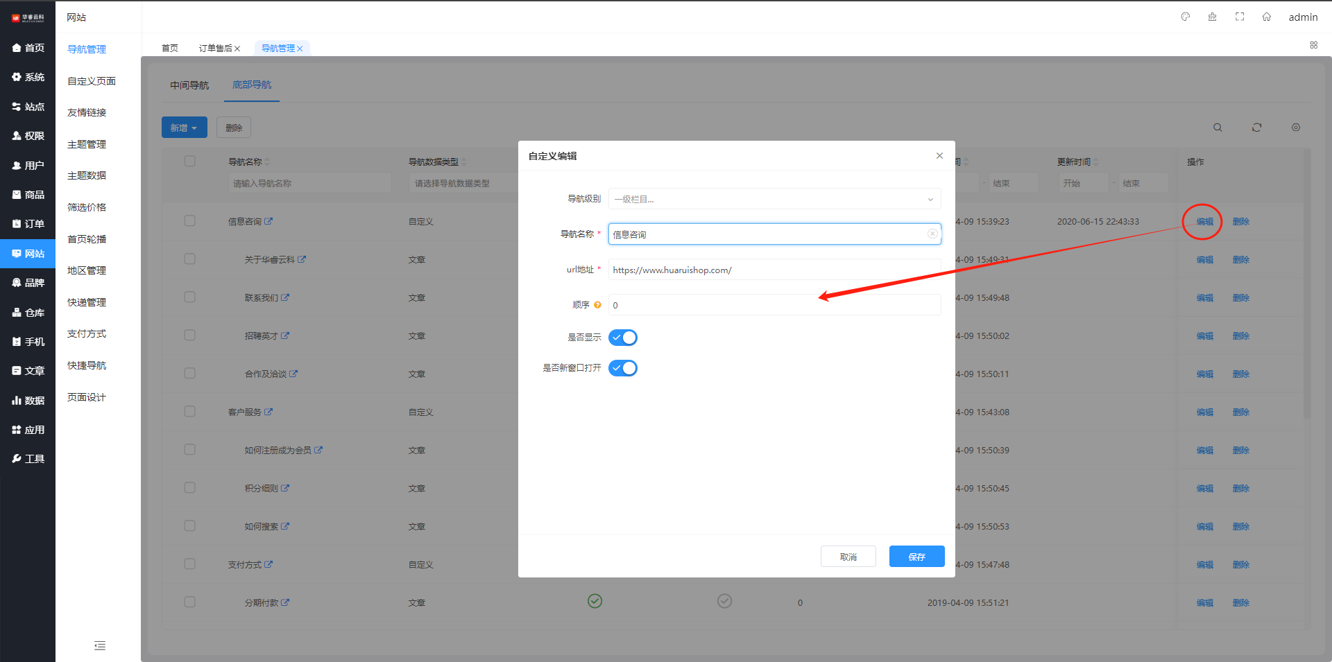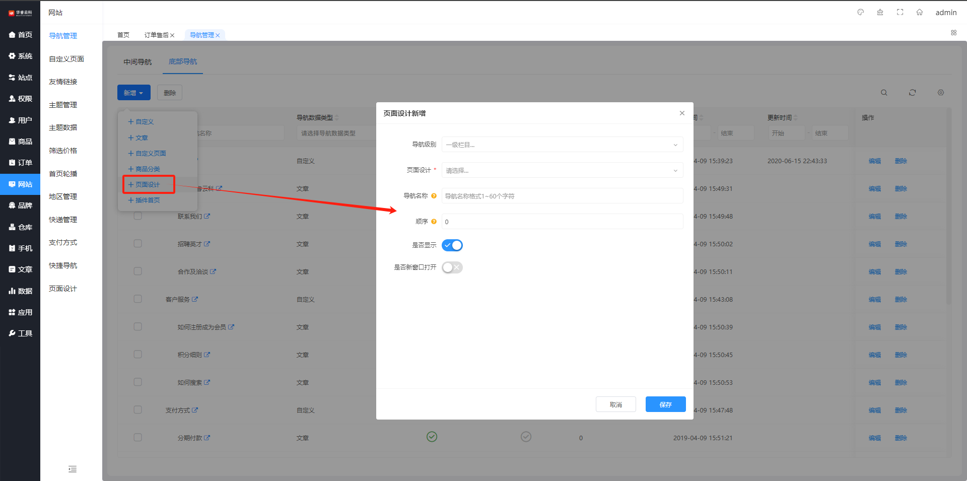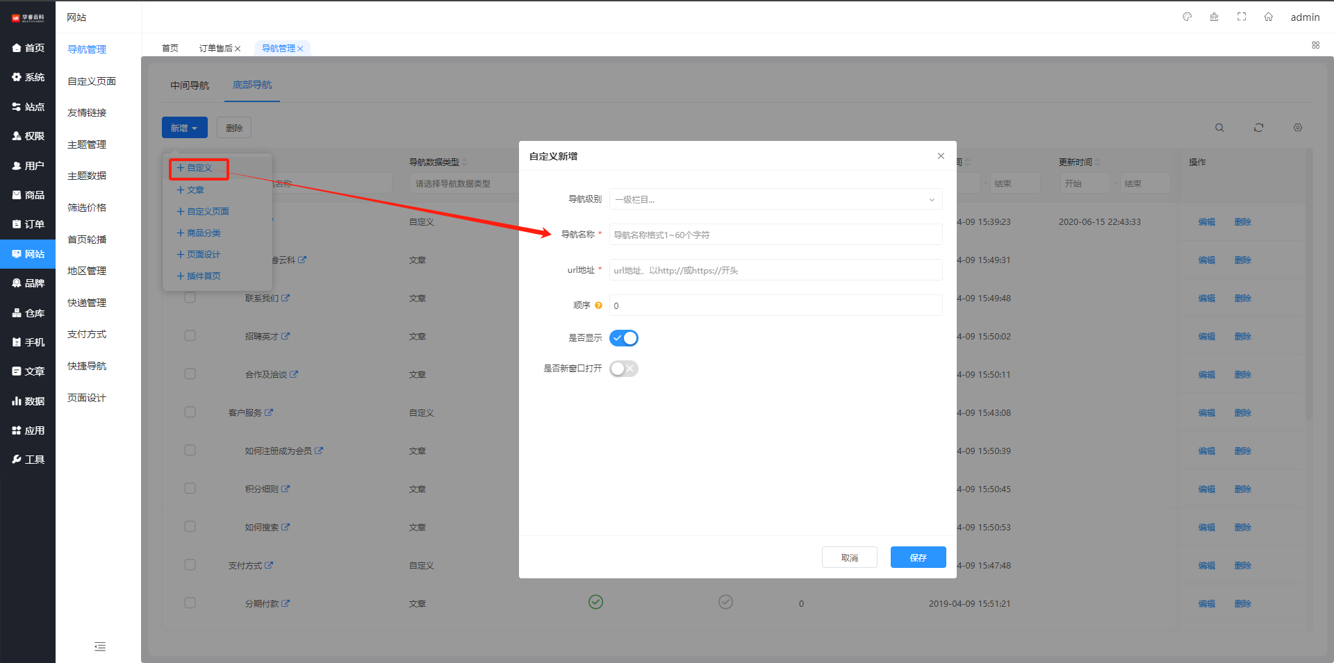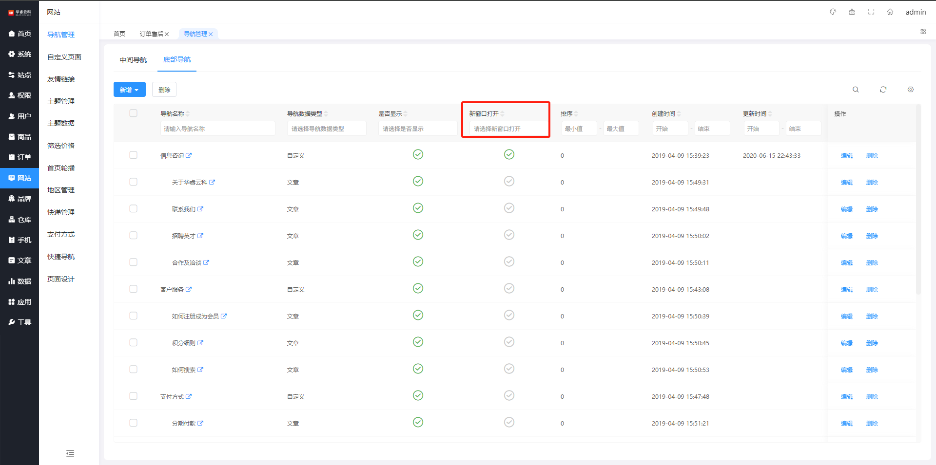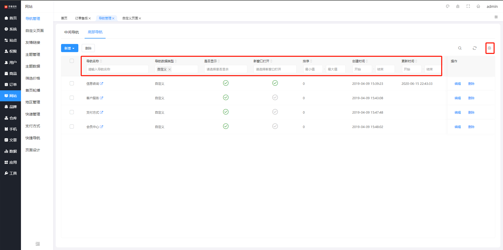 在底部导航列表页面,通过导航名称、导航数据类型、排序等查询,筛选条件可自定义勾选设置,如图所示: