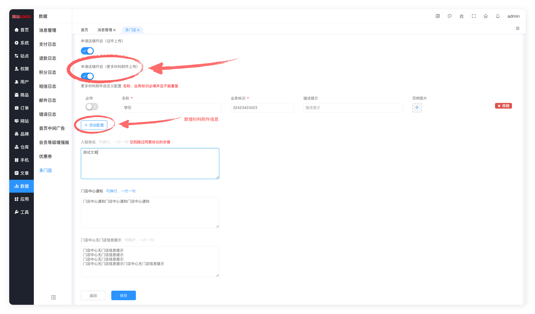 应用 → 应用管理 → 多门店 → 基础配置 → 店铺相关 → 开启/关闭申请店铺(更多材料附件上传)