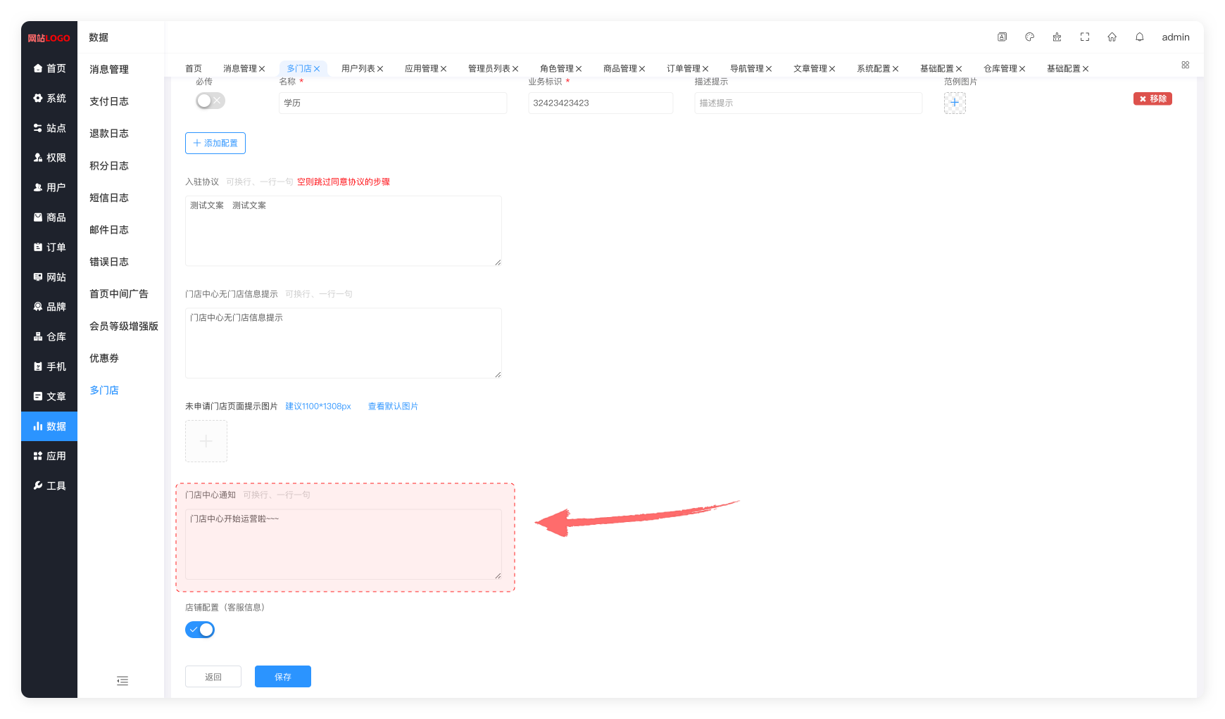 应用 → 应用管理 → 多门店 → 基础配置 → 店铺相关 → 门店中心通知