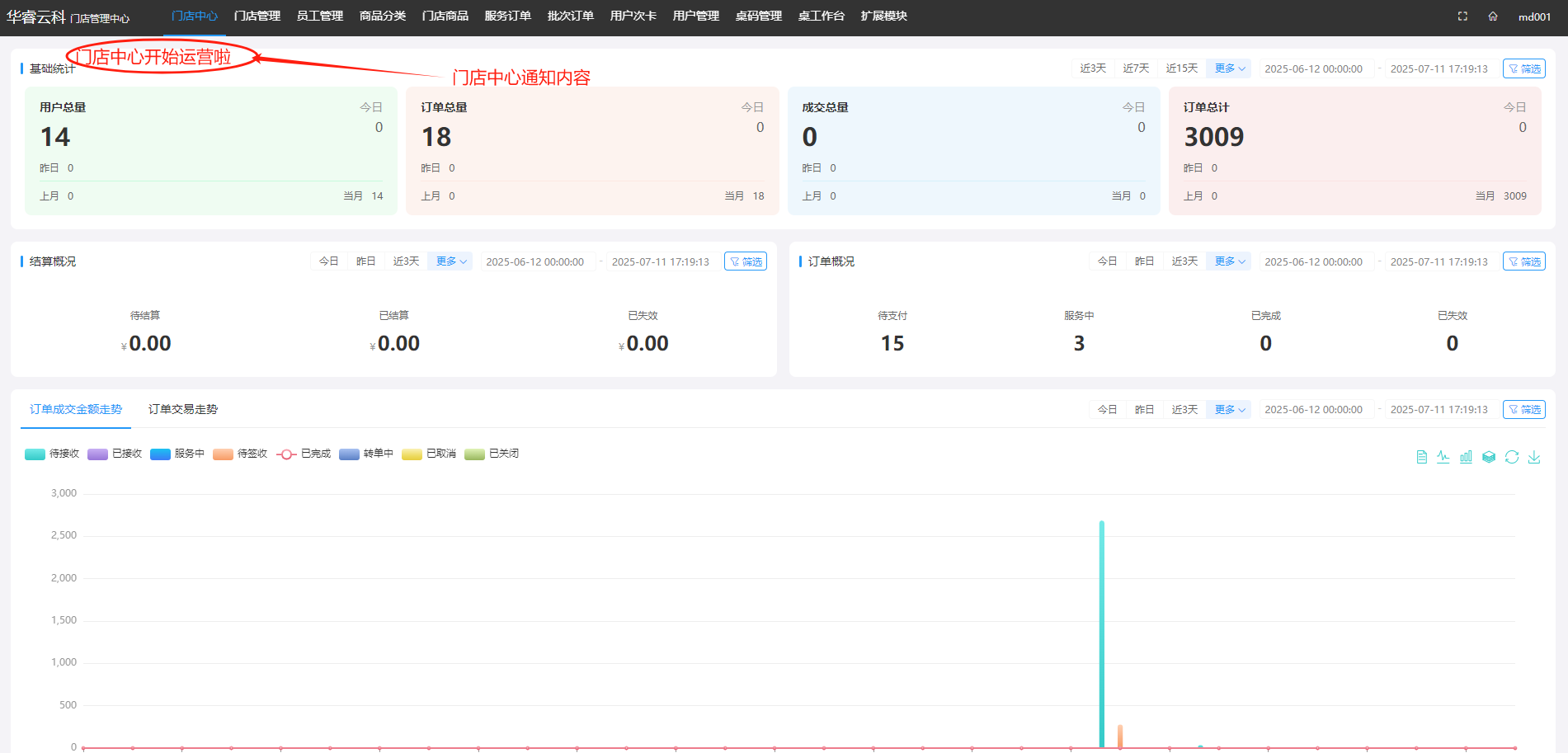 进入门店管理中心系统,在首页顶部显示通知内容