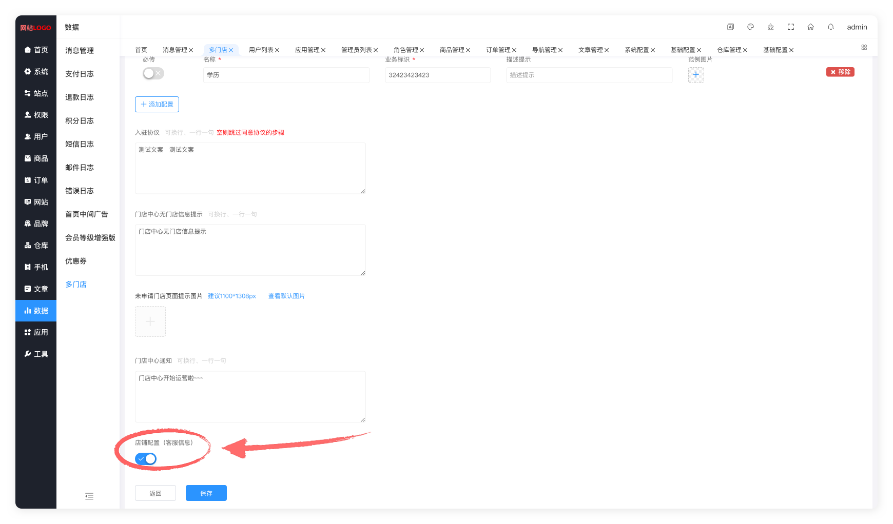 1.当开关开启时,进入门店管理中心,进入门店管理页面,点击配置信息,会显示客服服务模块的配置模块