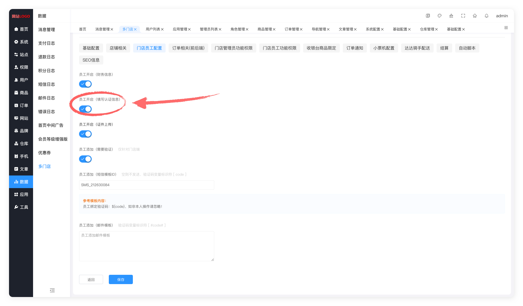 应用 → 应用管理 → 多门店 → 基础配置 → 门店员工配置 → 员工开启(填写认证信息)
