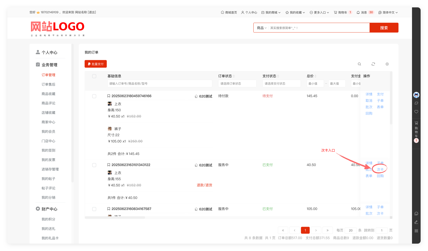 2.当开关开启时,进入商城个人中心订单管理列表页,在列表右侧操作区域显示次卡入口。