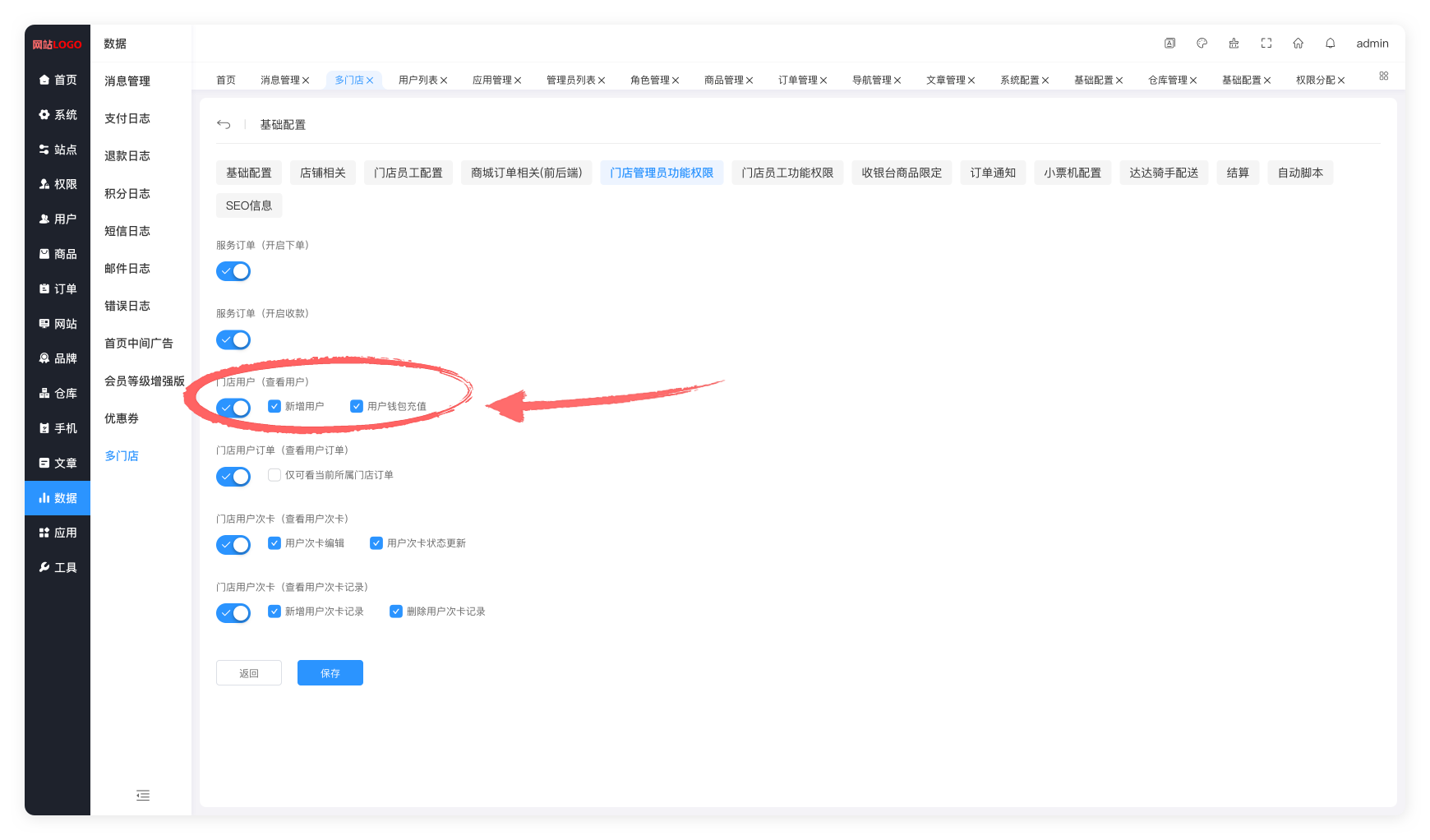 应用 → 应用管理 → 多门店 → 基础配置 → 门店管理员功能权限 → 门店用户(查看用户)