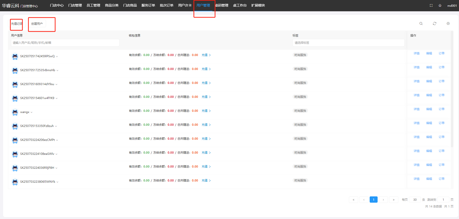 进入门店管理系统页,顶部tab显示用户管理模块入口,在用户管理页面左上显示充值记录和创建用户入口。