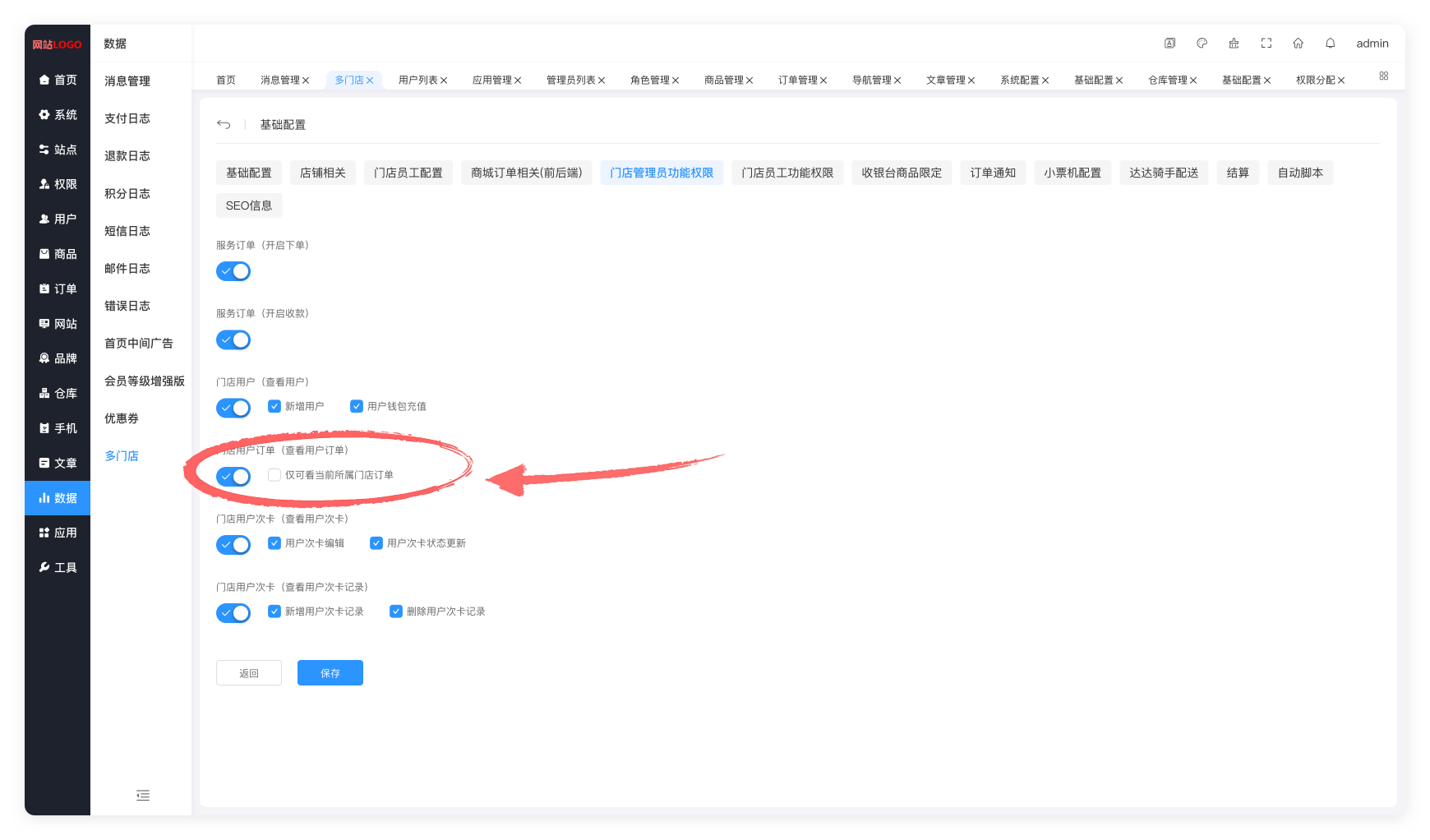 应用 → 应用管理 → 多门店 → 基础配置 → 门店管理员功能权限 → 门店用户订单(查看用户订单)
