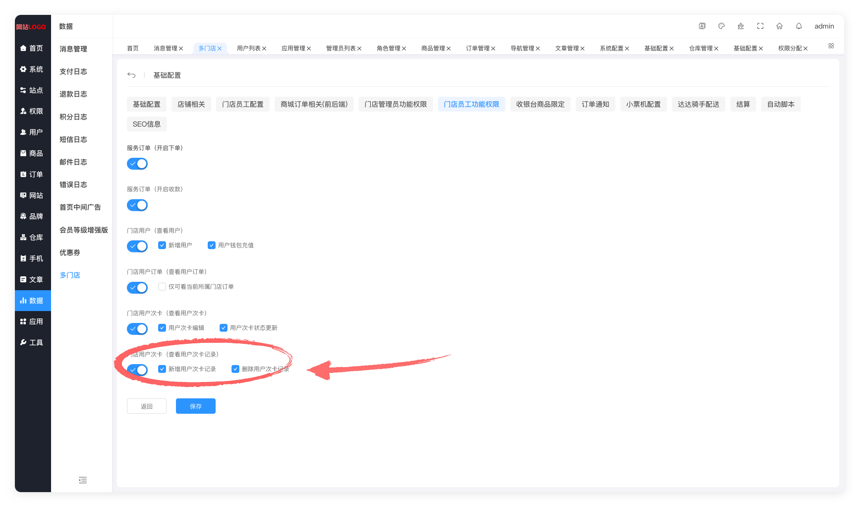 应用 → 应用管理 → 多门店 → 基础配置 → 门店管理员功能权限 → 门店用户次卡(查看用户次卡记录)