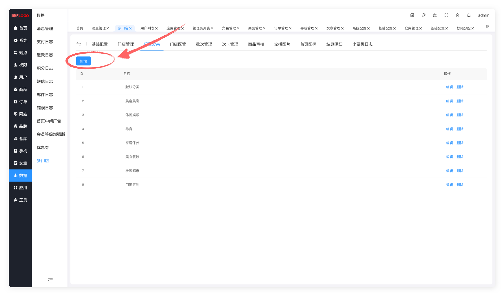 2.进入门店分类页面,点击新增按钮。