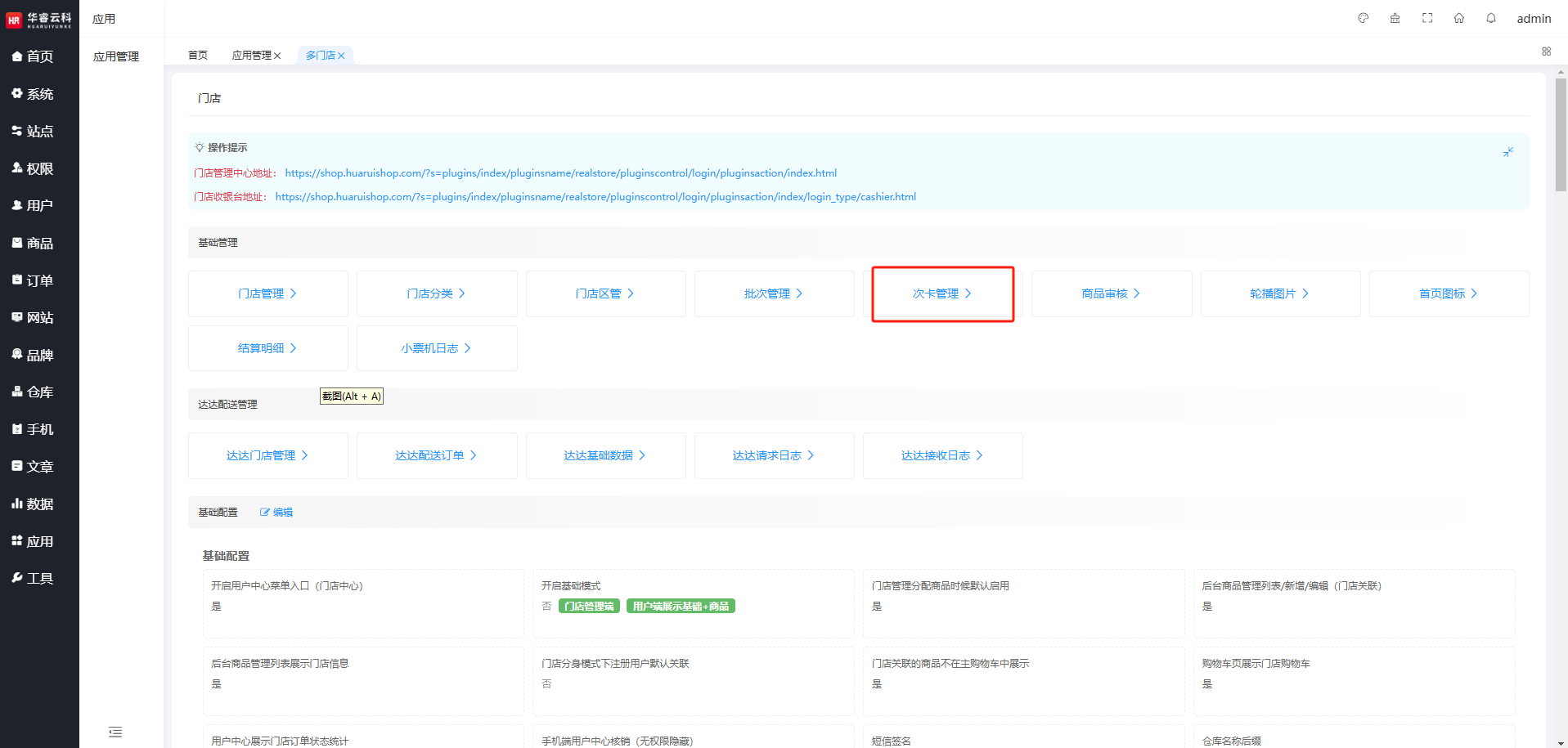应用 → 应用管理 → 多门店 → 基础管理 → 次卡管理 → 用户次卡