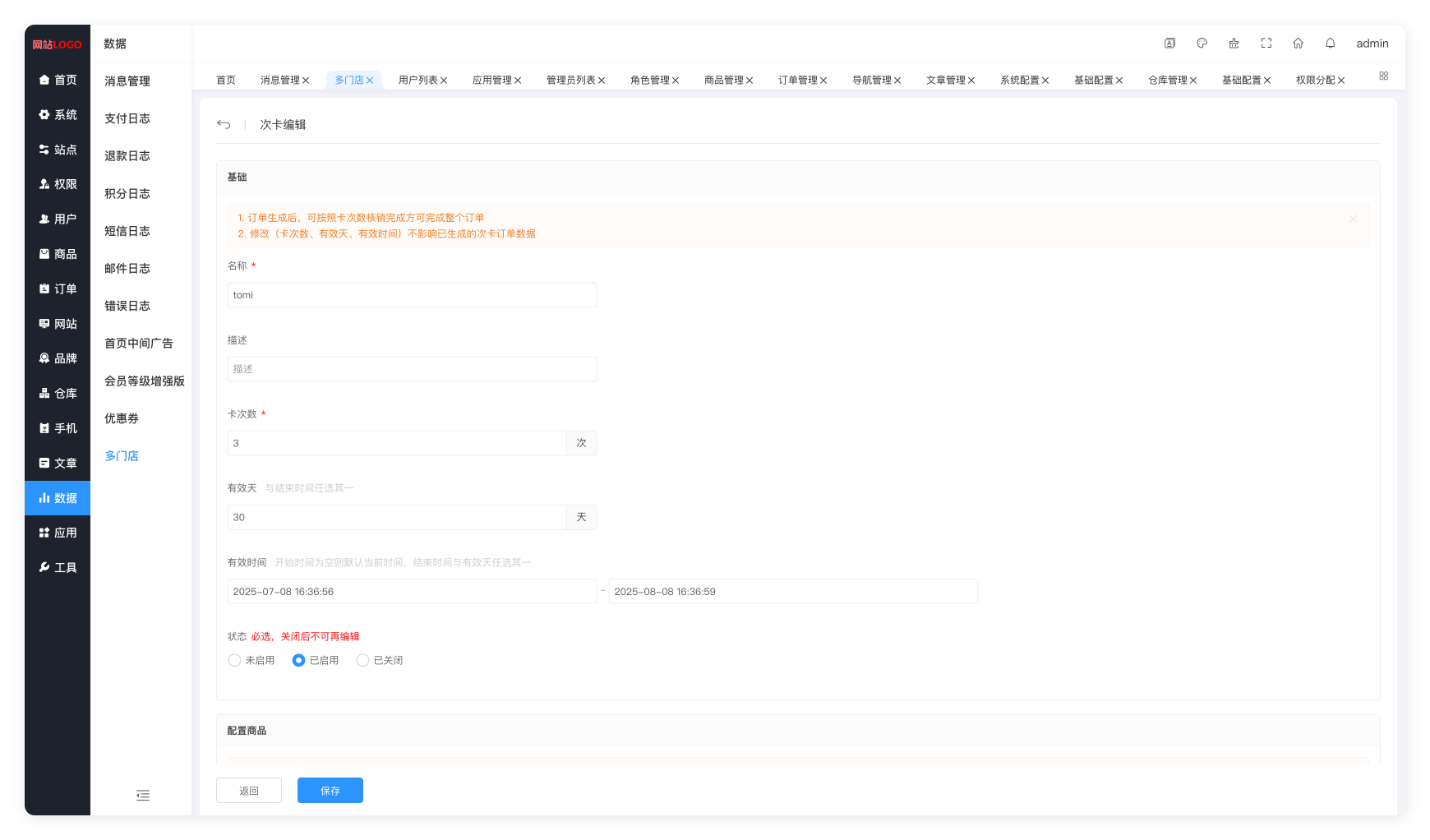 应用 → 应用管理 → 多门店 → 基础管理 → 次卡管理 → 编辑