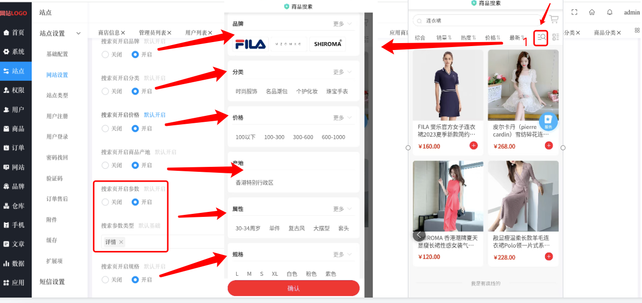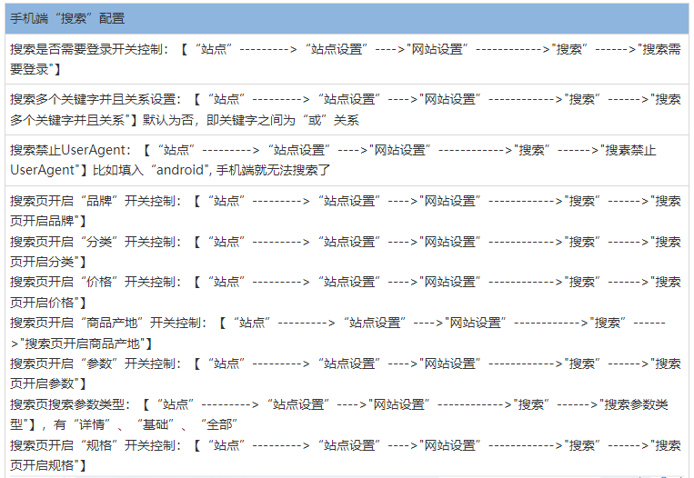 搜索商品展示样式:【“站点”——>“站点设置”—->”网站设置”——>”搜索”——>”搜索商品展示样式”】可以为“九宫格”或“图文列表”。