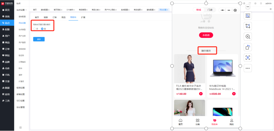 购物车展示“猜你喜欢”:【“站点”——>“网站设置”——>”购物车”—–>“购物车页展示猜你喜欢”】