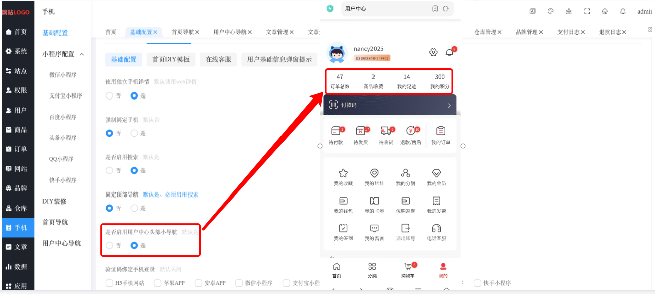 “我的”顶部订单统计开关控制:【“手机”——->”基础配置”—–>“APP/小程序”—–>“是否启用用户中心头部小导航”】
