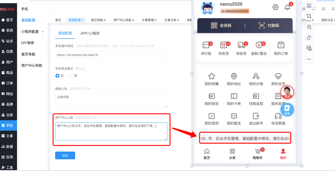 用户中心公告:【“手机”—->“基础配置”—->“基础配置”】中的(用户中心公告)设置